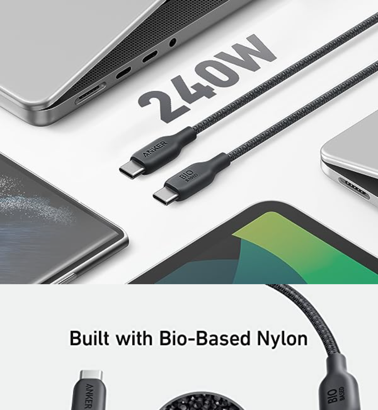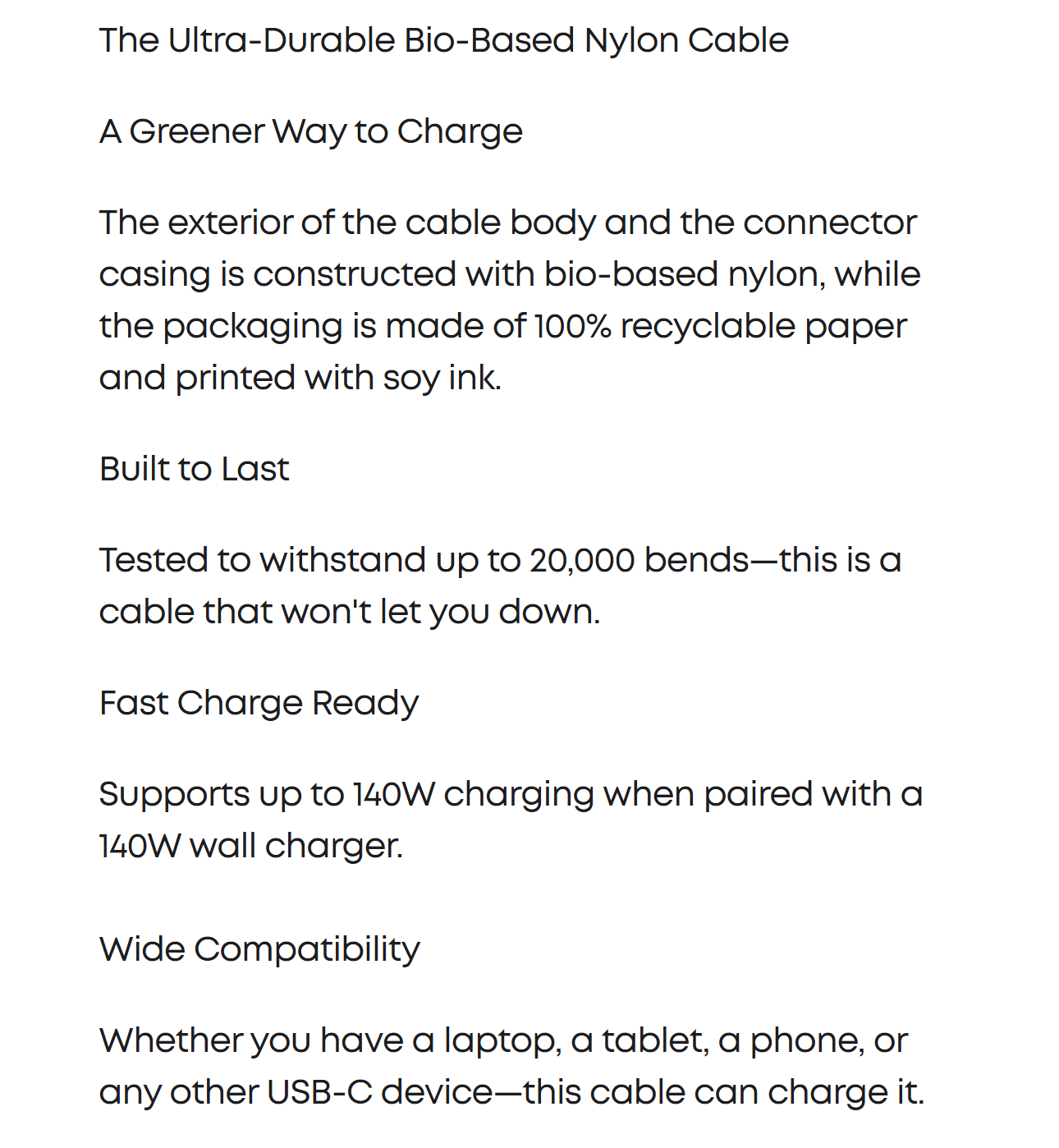 A hard-wearing nylon exterior and a bulletproof fiber core combine to create a USB C cable that can withstand up to 5,000 bends.