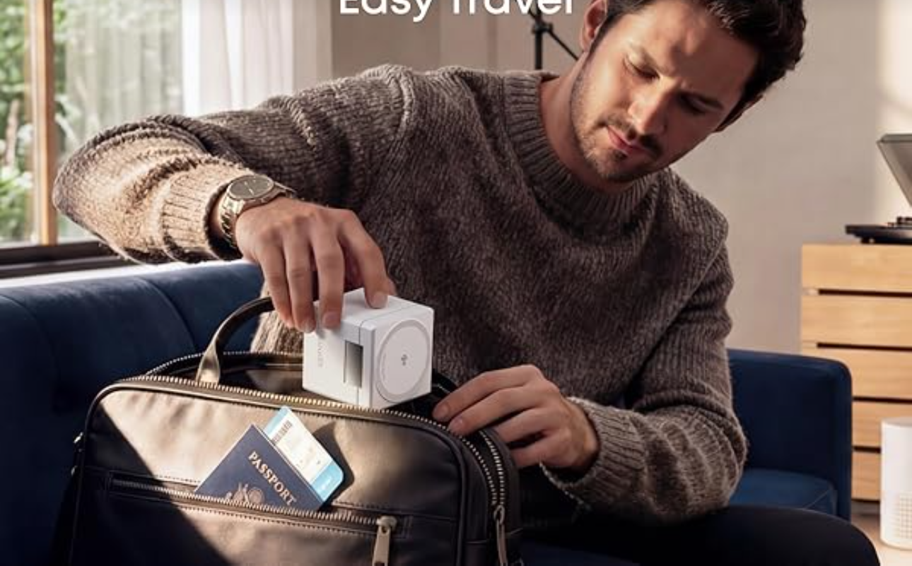 This foldable, ultra-compact charger fits easily in your palm and is perfect for travel or business use. It comes with interchangeable UK and EU plugs for international charging convenience. (Note: Charger and interchangeable plugs included.)