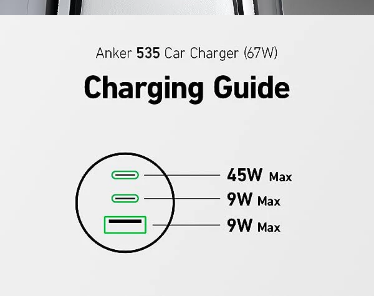 Anker 535 Car Charger (67W), 3.2 ft (97.53 cm) USB-C to USB-C cable, welcome guide, our worry-free 18-month warranty, and friendly customer service.