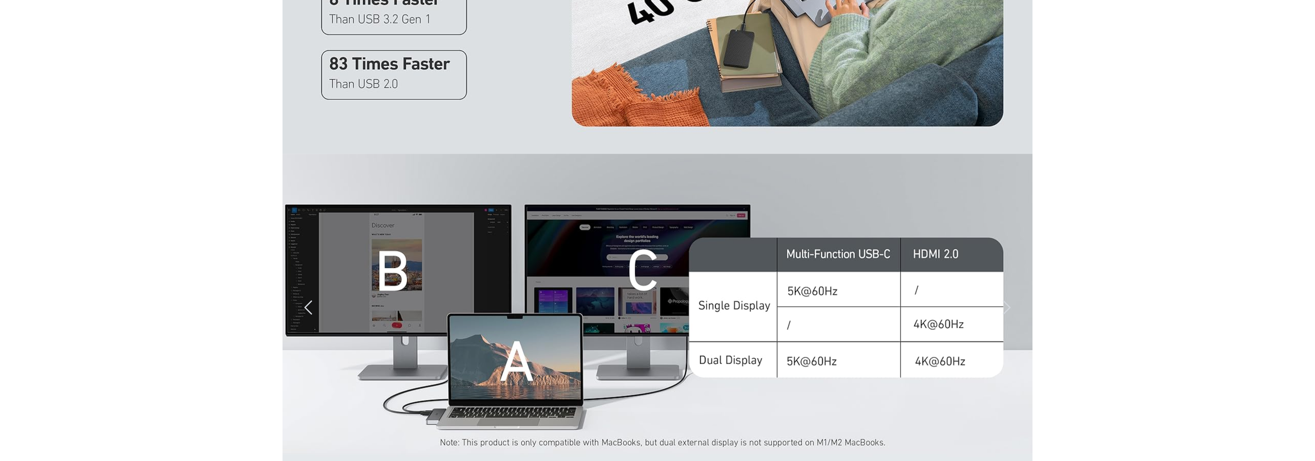 The HDMI port supports a resolution of 4K@60Hz while the multi-function port supports 5K@60Hz. Connect to both simultaneously to enjoy crystal—clear streaming or mirroring across 2 displays.