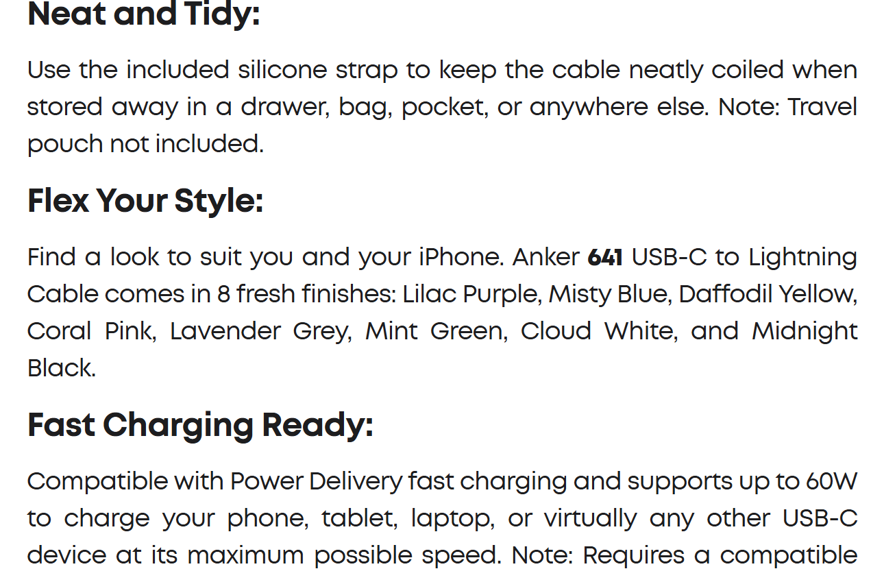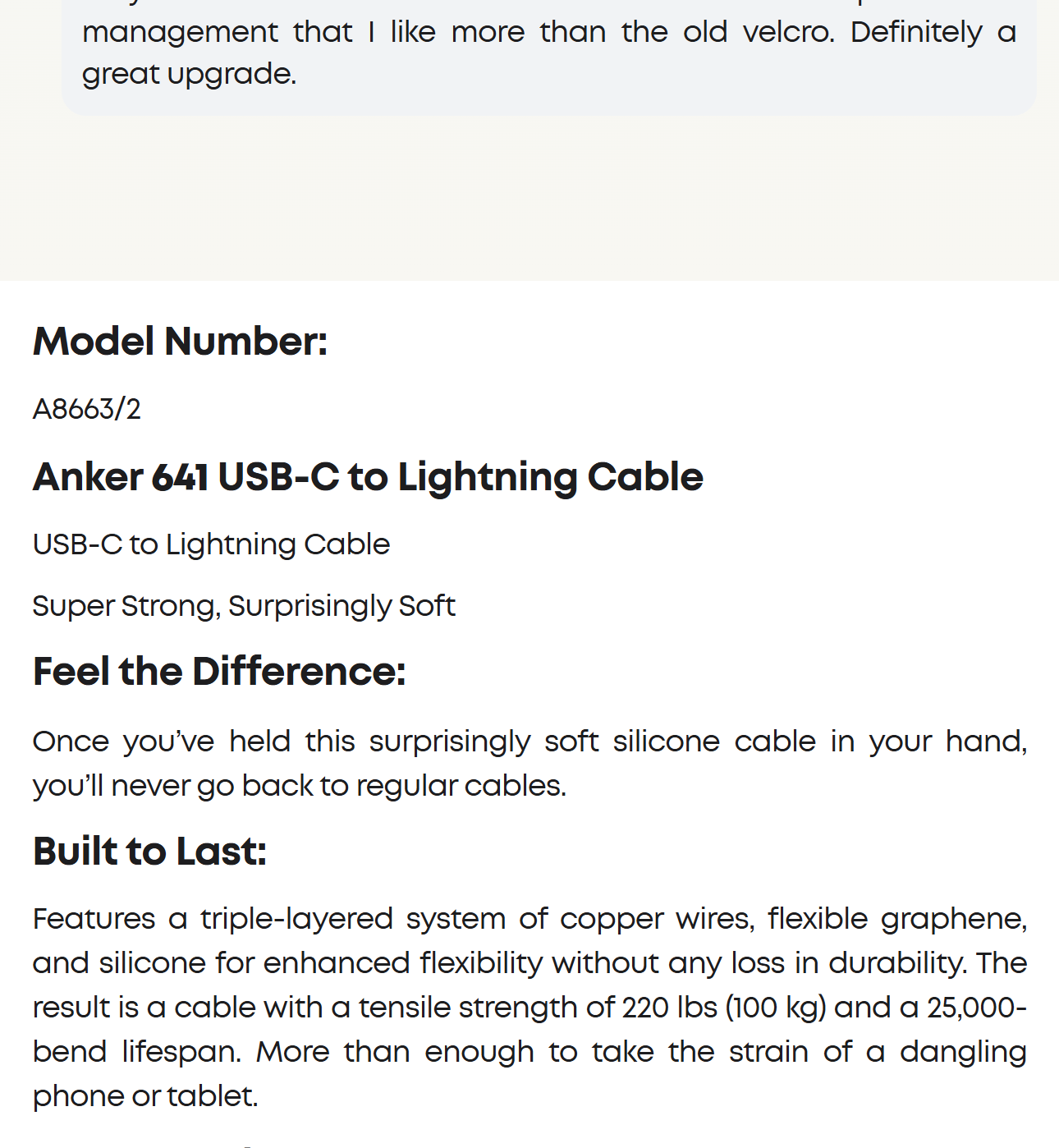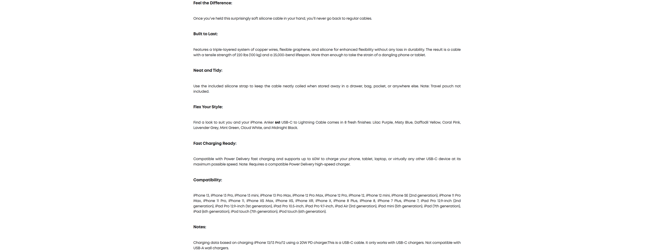 Our softest cable ever is also one of our strongest. Thanks to a 25,000-bend lifespan, this cable is more than ready to handle the stresses and strains of charging on the go.