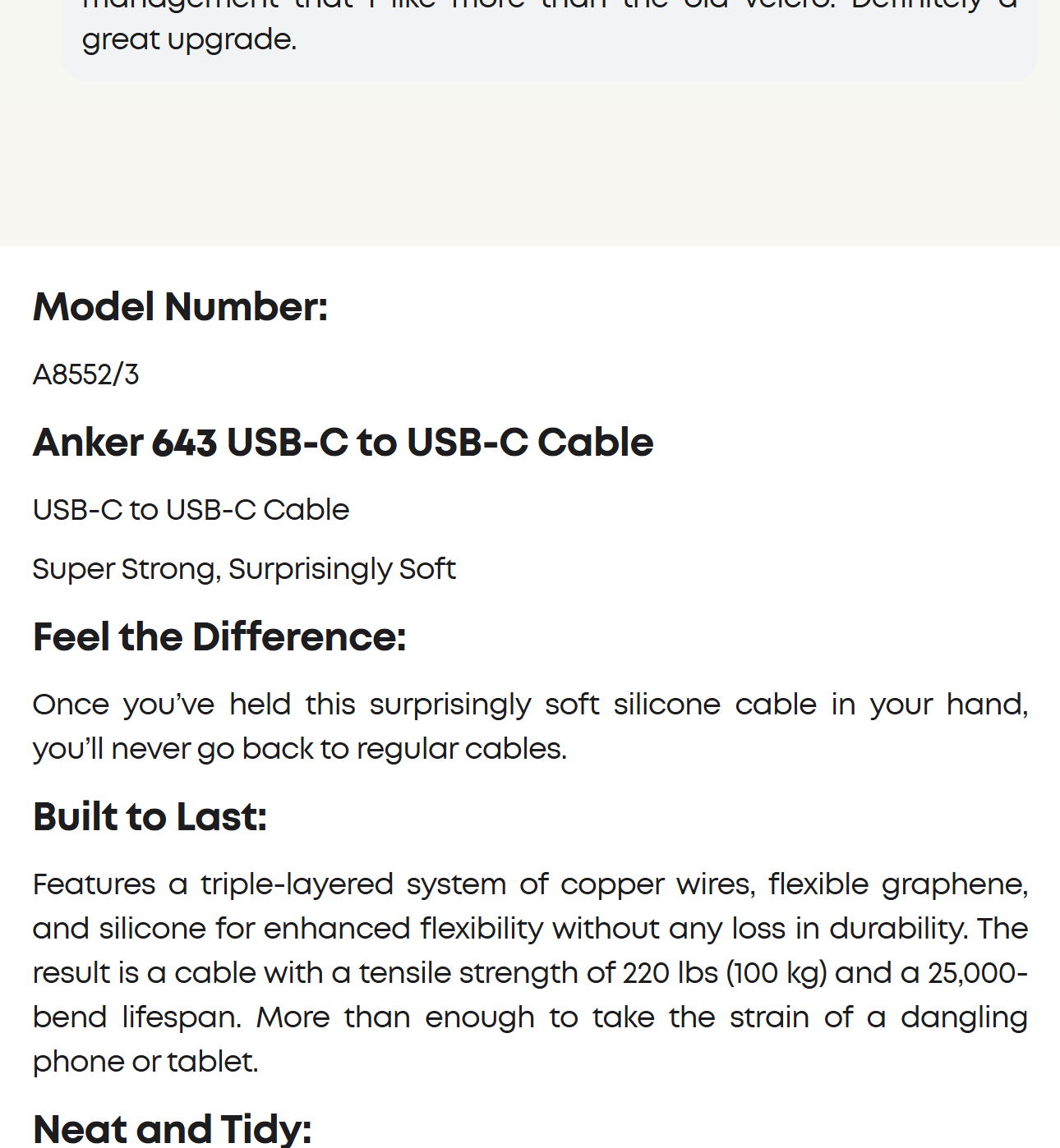Anker 643 USB-C to USB-C Cable (Flow, Silicone) / PowerLine III Flow USB-C to USB-C Cable, silicone cable tie, welcome guide, our worry-free 18-month warranty, and friendly customer service.