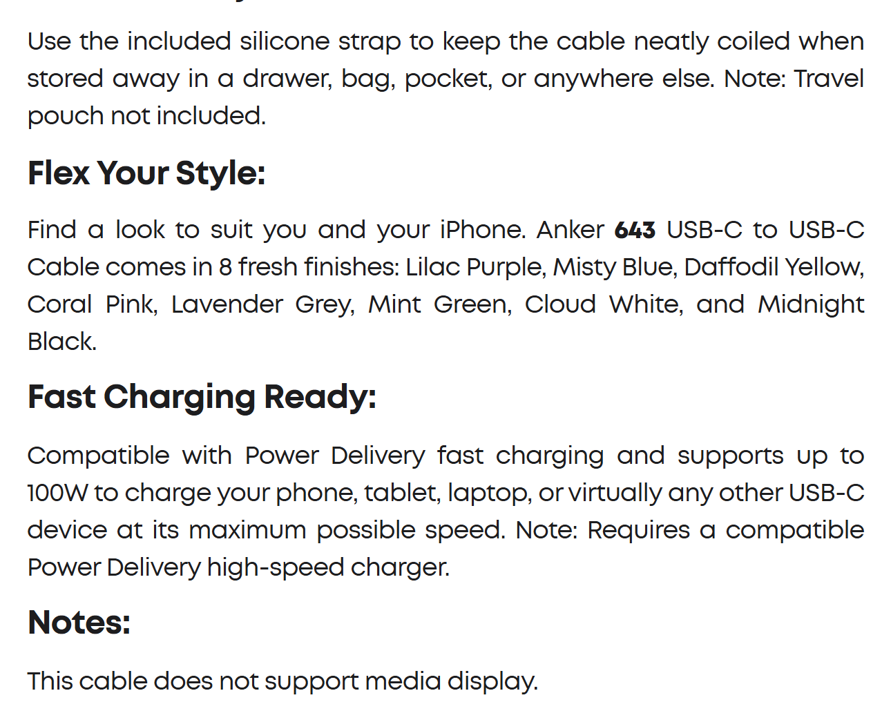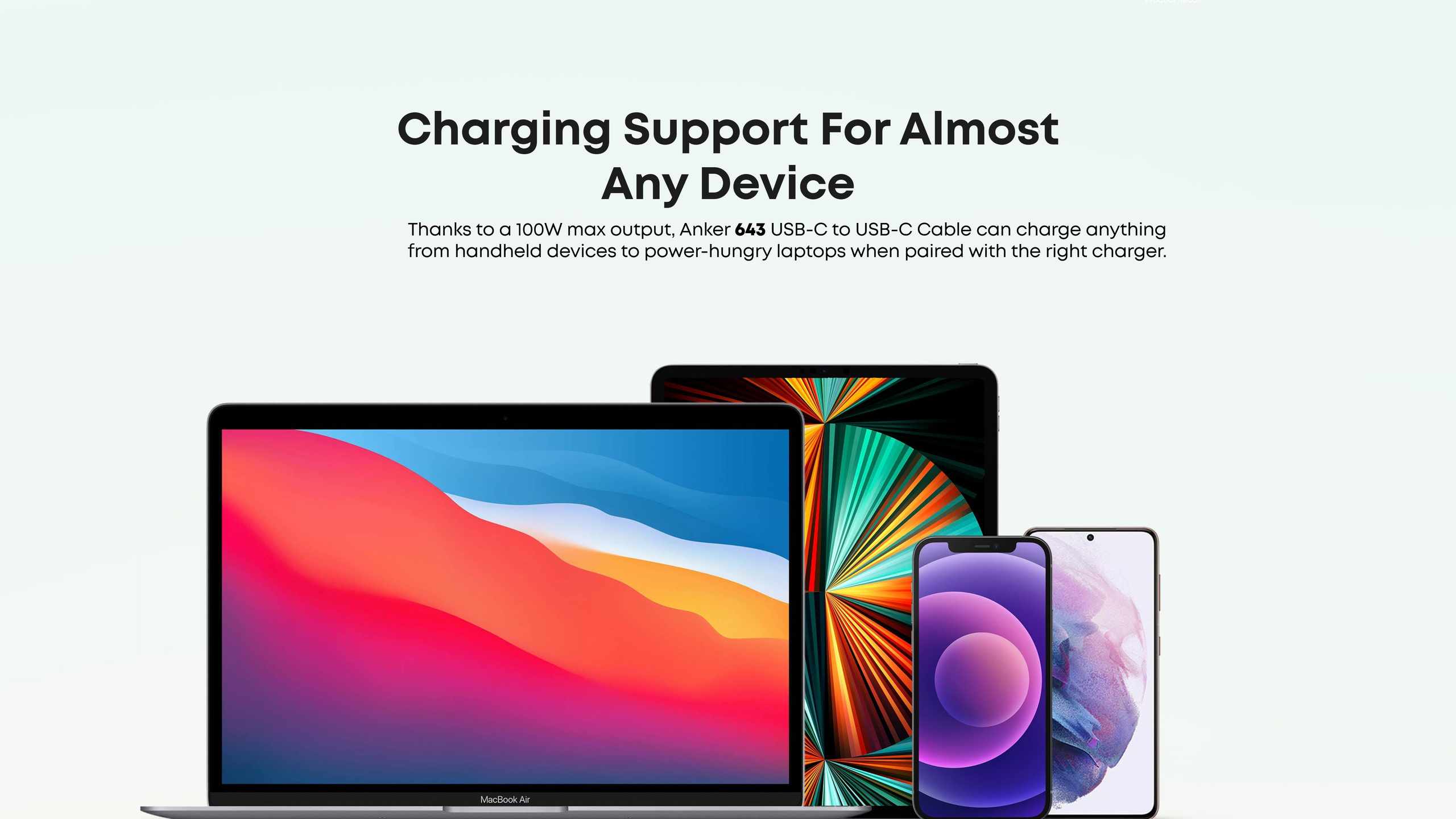 Supports a max power output of 100W when paired with a 100W or above wall charger to power up virtually any USB-C device, including phones, tablets, and laptops. (This cable does not support media display.)