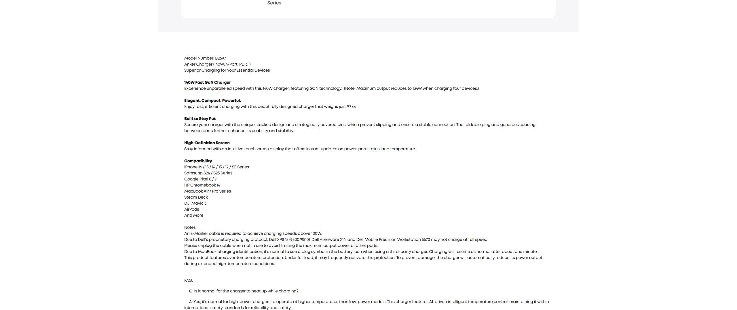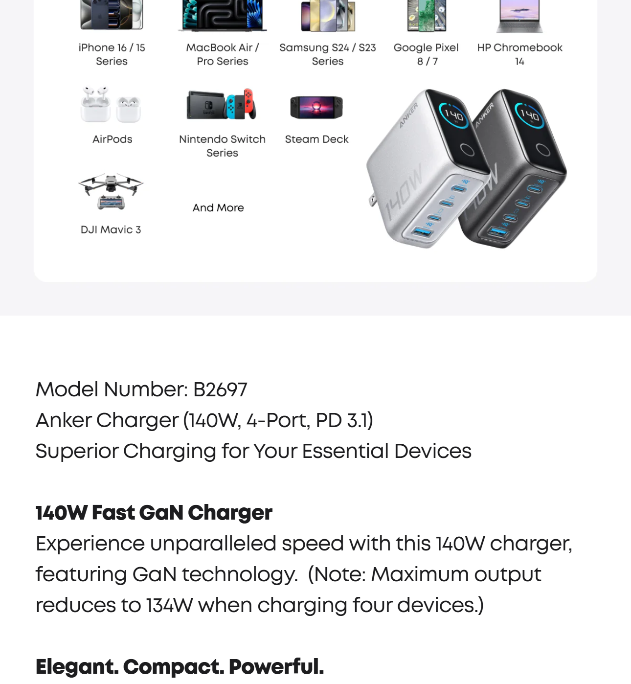 Anker Charger (140W, 4-Port, PD 3.1), 5 ft 240W USB-C to USB-C cable, user manual, 18-month warranty, and our friendly customer service.