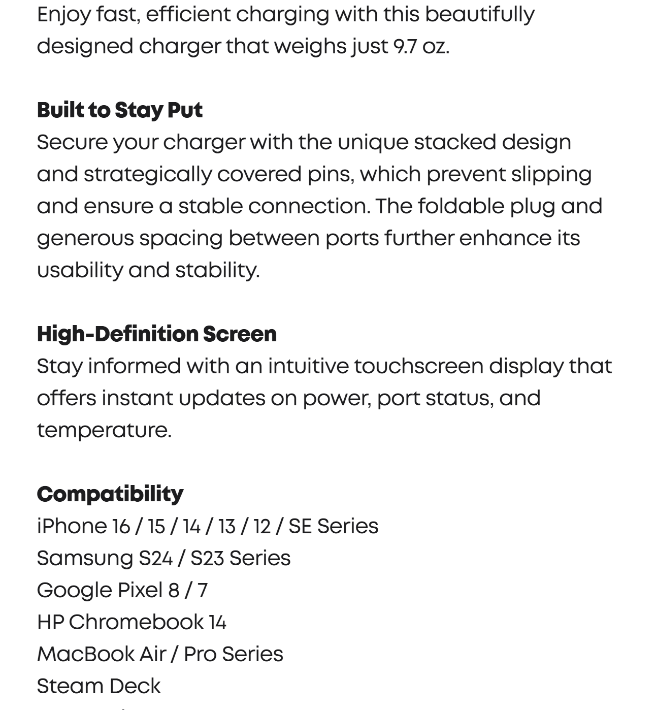 The high-definition color display provides a detailed view of the charging status, temperature, and port details, keeping you fully informed.