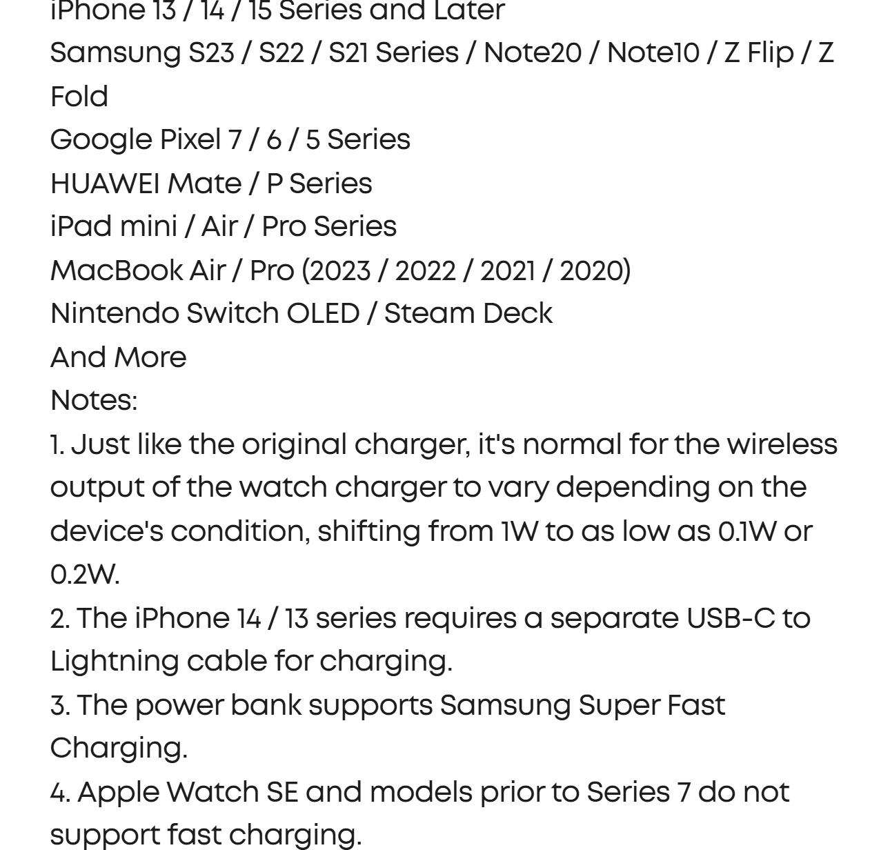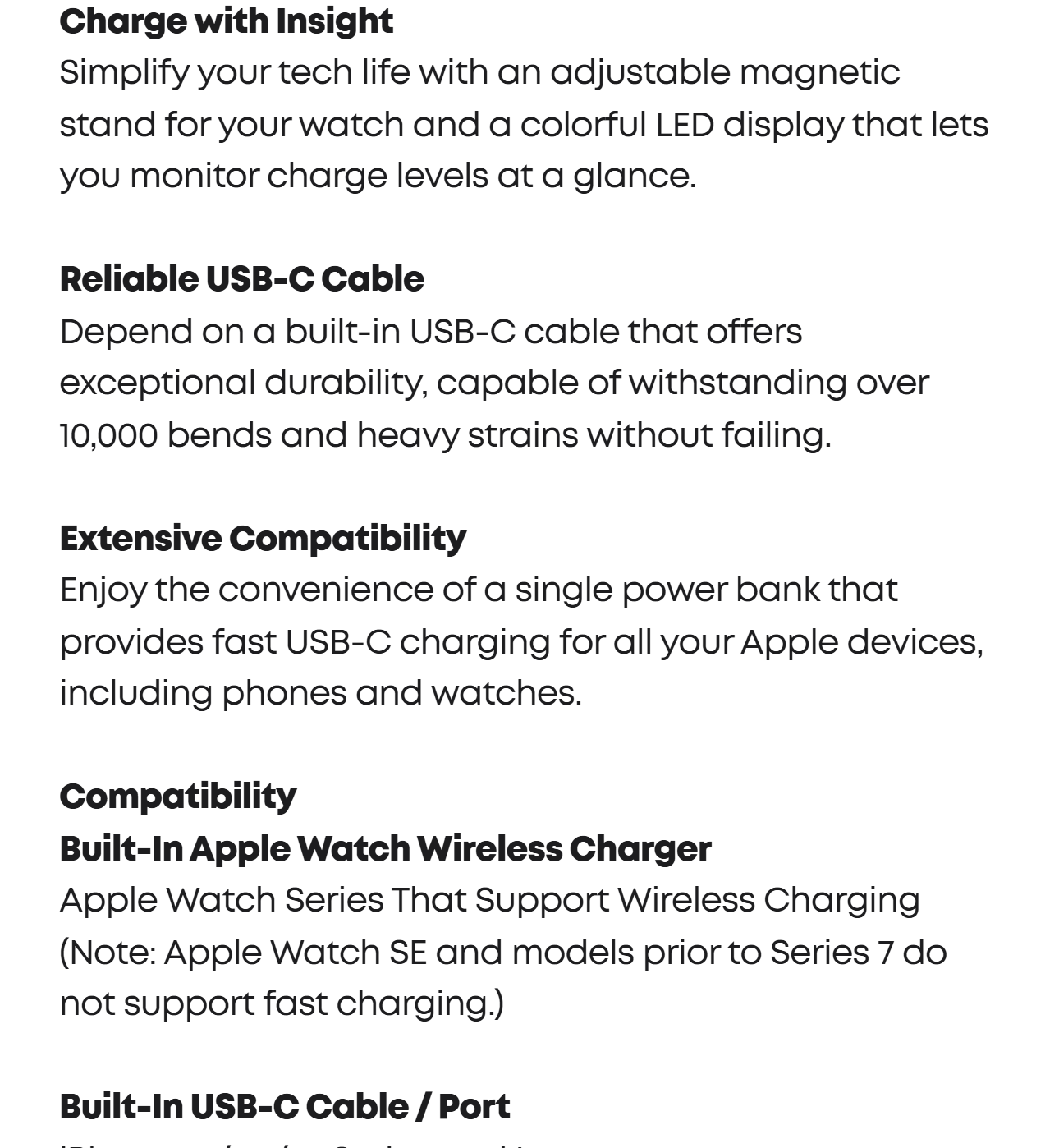 Supports simultaneous device charging with the built-in cable or port, offering up to 30W, alongside a wireless watch charger that provides up to 5W. The power bank fully recharges in 1.5 hours with a 30W maximum input.