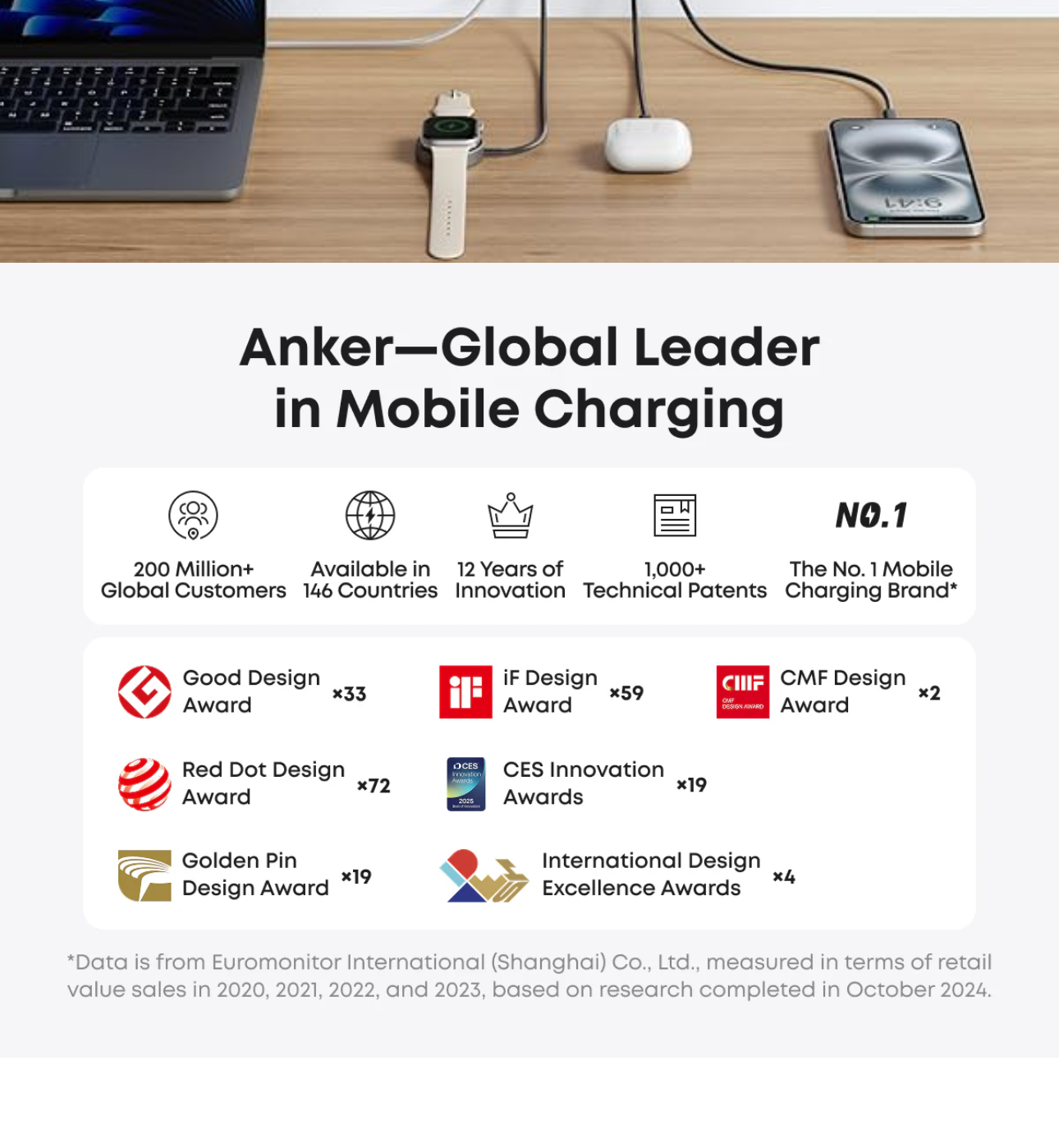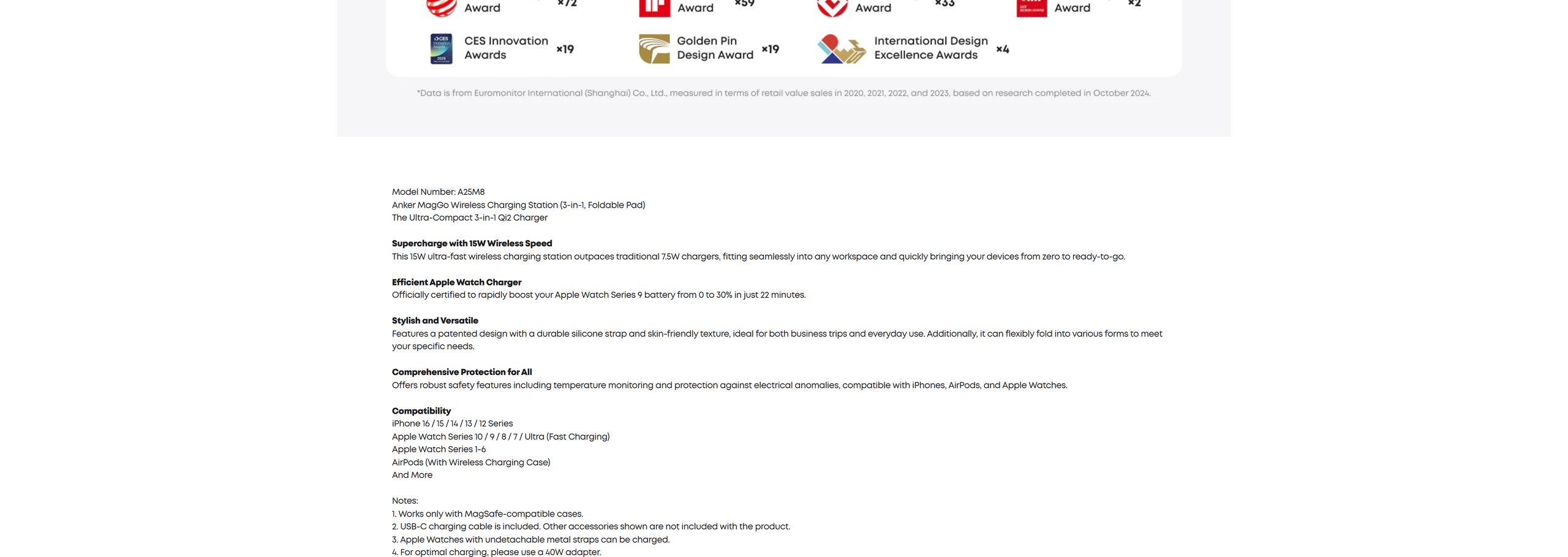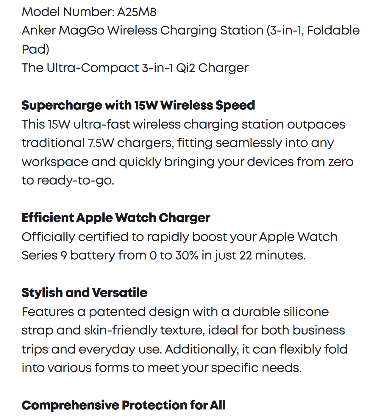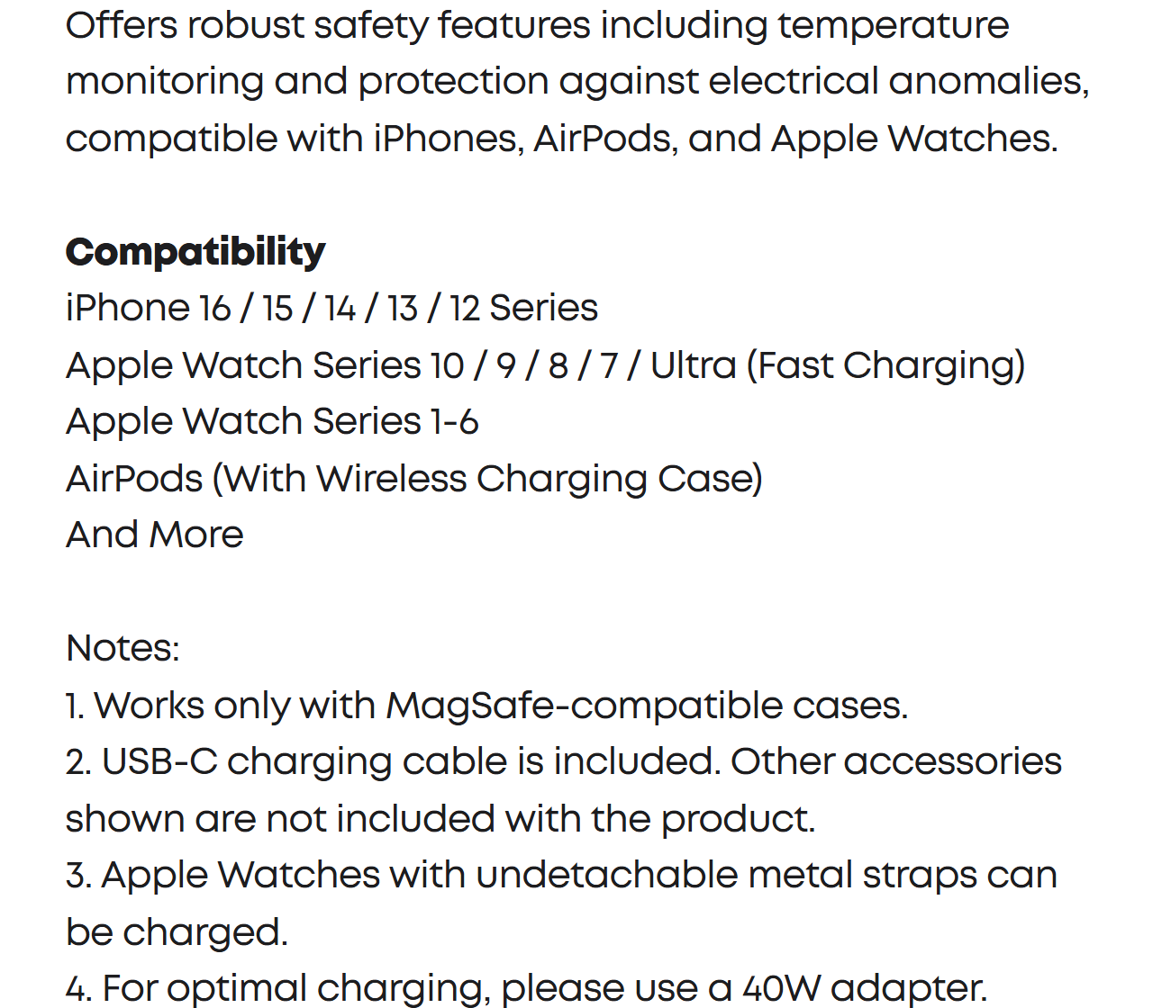 Quickly power up your iPhone 15 Pro to 20% in 15 minutes and an Apple Watch Series 9 to 30% in 22 minutes with a certified and MagSafe-compatible wireless charger. (Note: This product is not a power bank.)