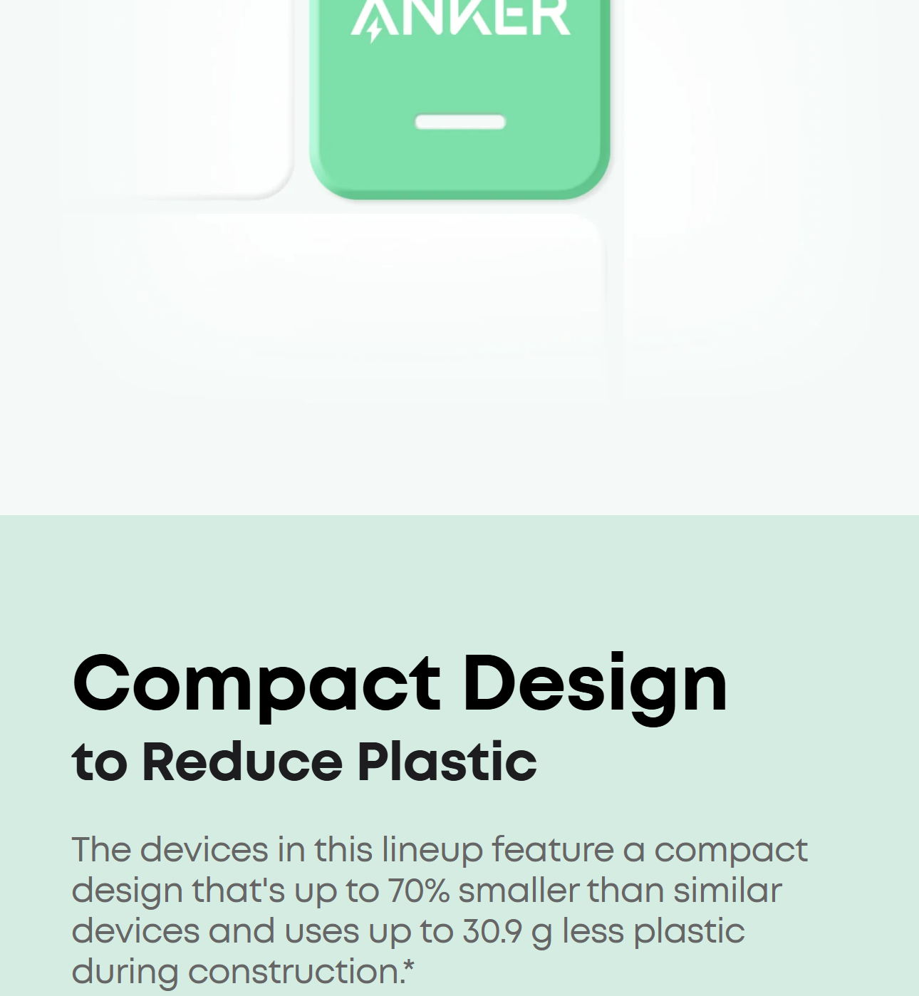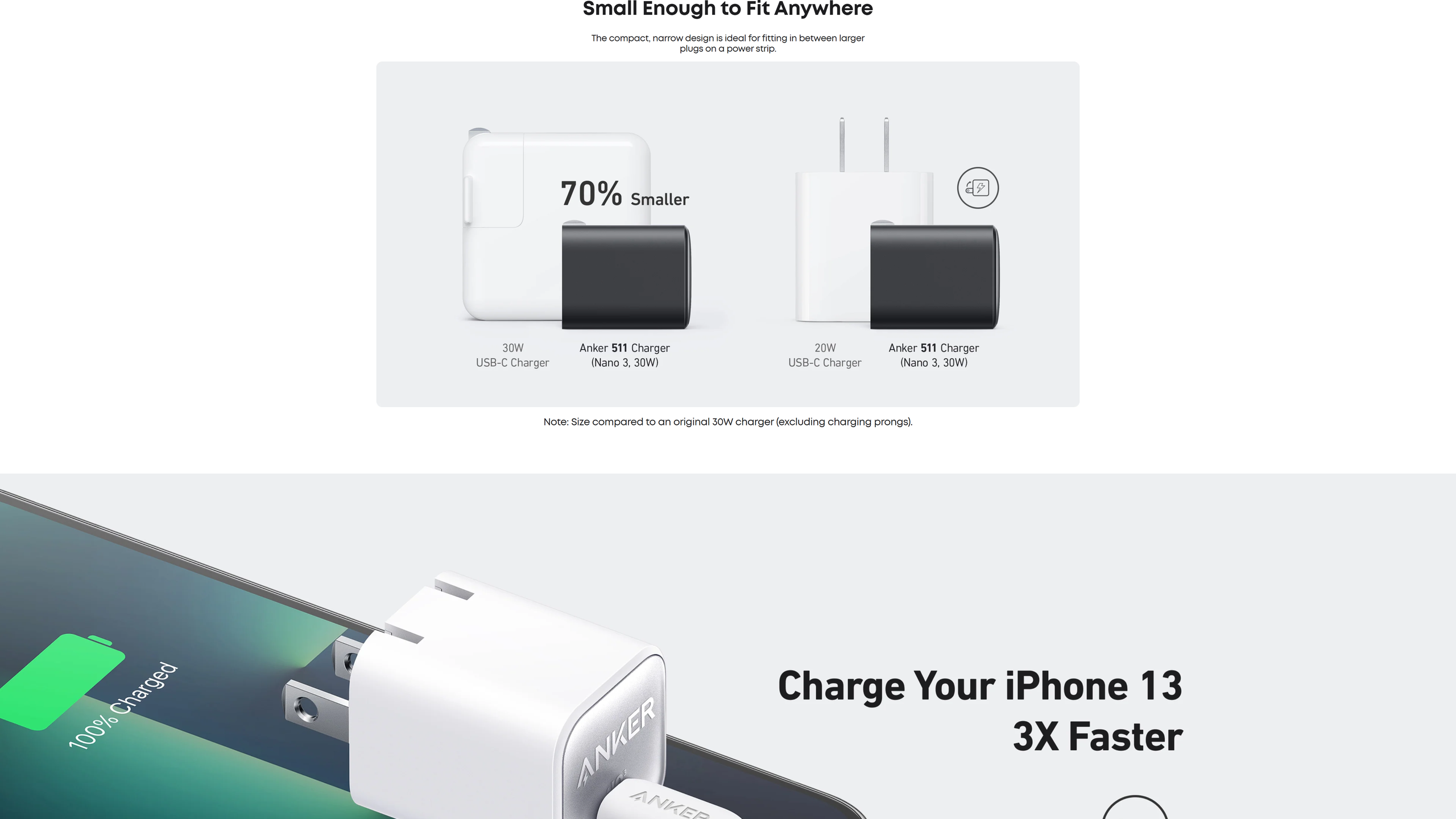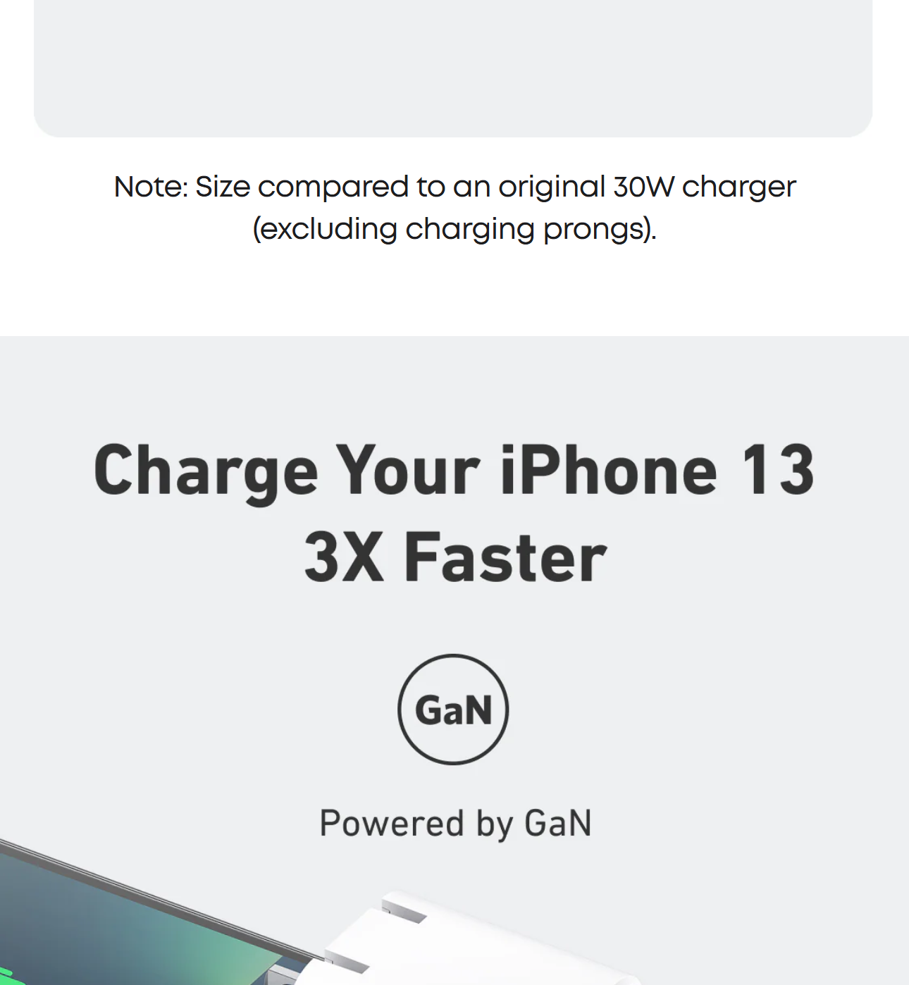 By swapping out silicon for Gallium Nitride (GaN) we've been able to fit 30W of power into a charger that's just 1.12 inches thick, and 70% smaller than an original 30W charger.
