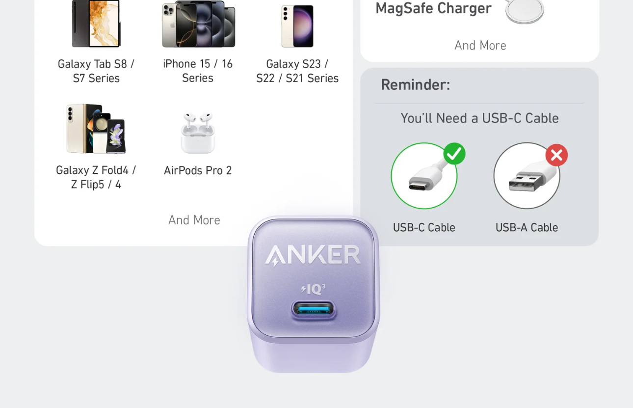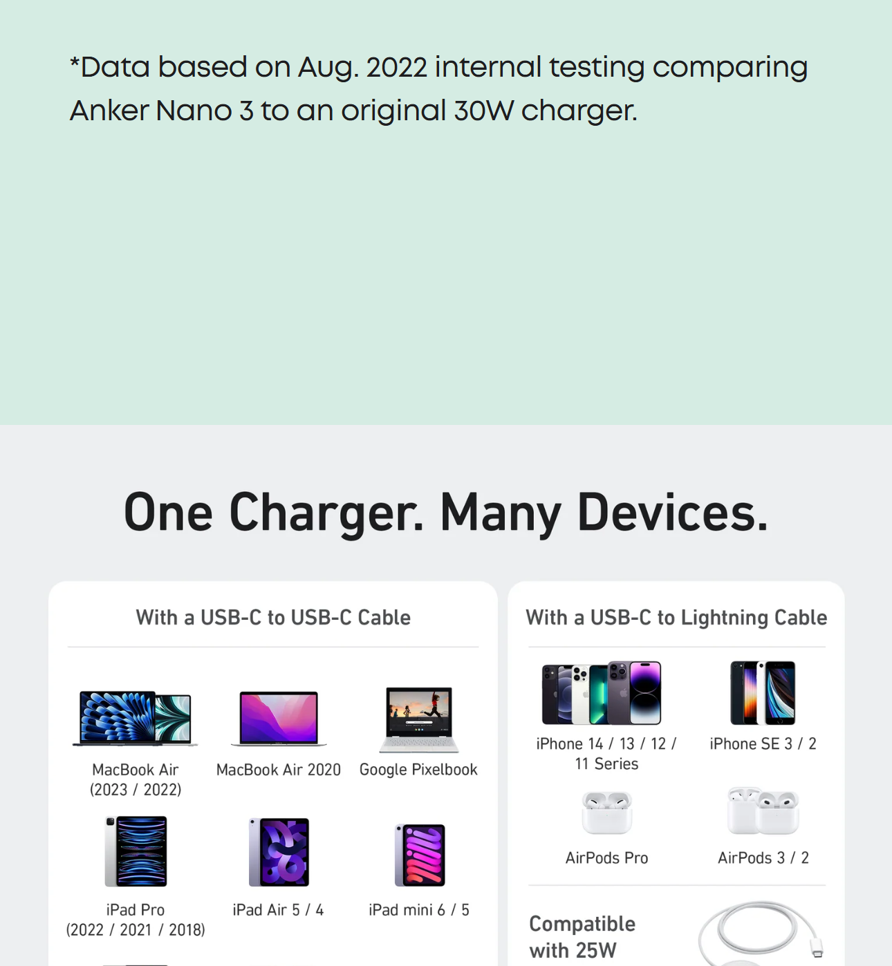 Anker 511 Charger (Nano 3, 30W) / Anker Nano Charger (30W), welcome guide, our worry-free 24-month warranty, and friendly customer service (cable not included).