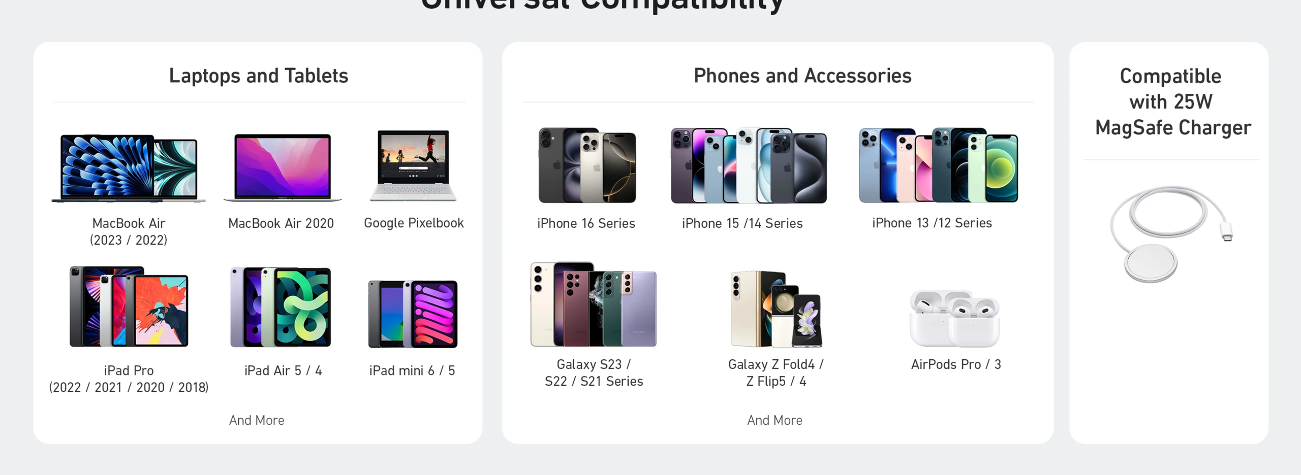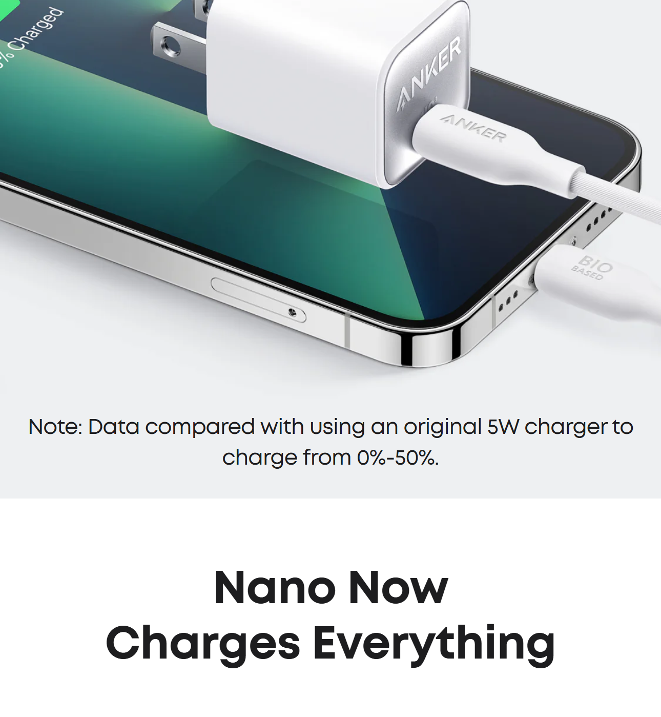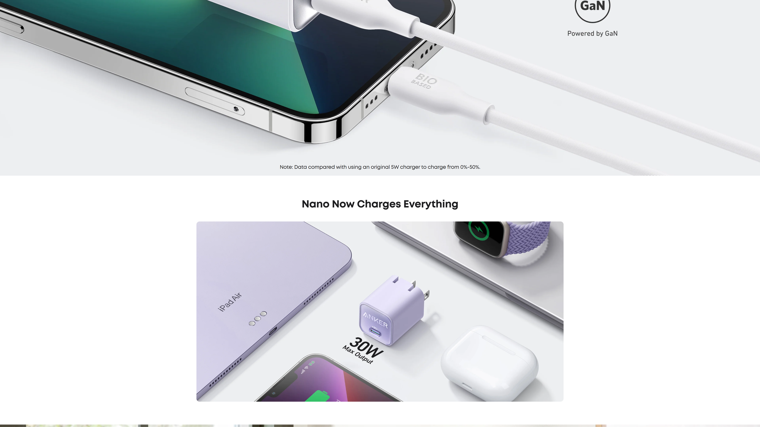 Delivers 30W fast charging, powering up an iPhone 15 Pro to 50% in just 1.5 hours and an iPad Air (5th Generation) to 50% in only 43 minutes. Also compatible with Samsung's 25W Super Fast Charging.