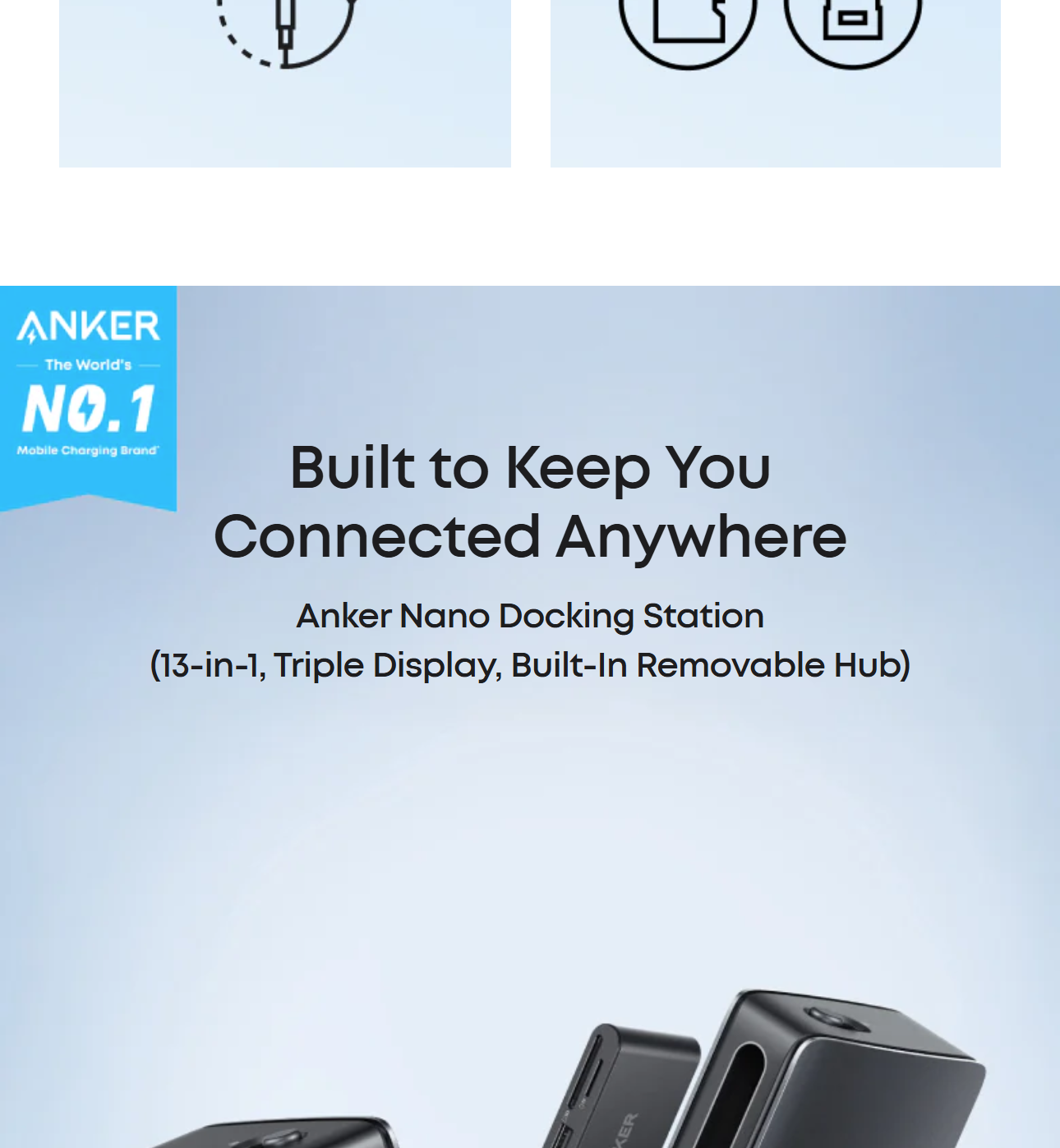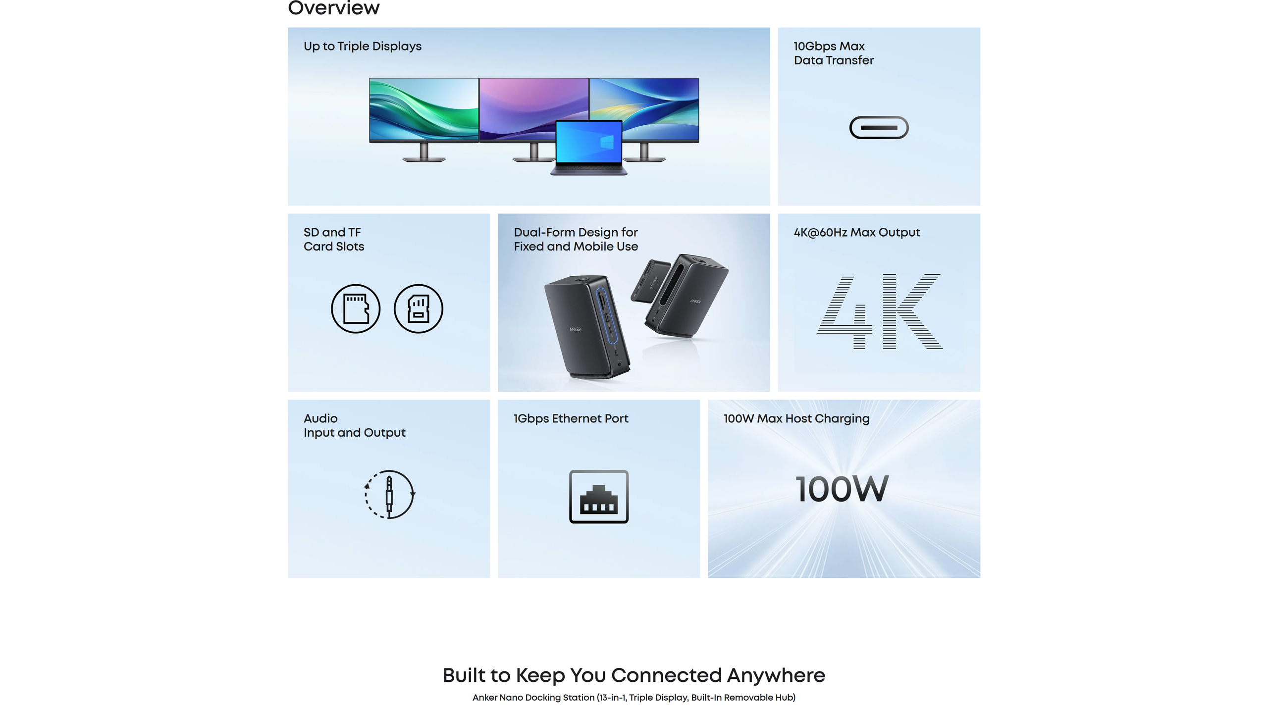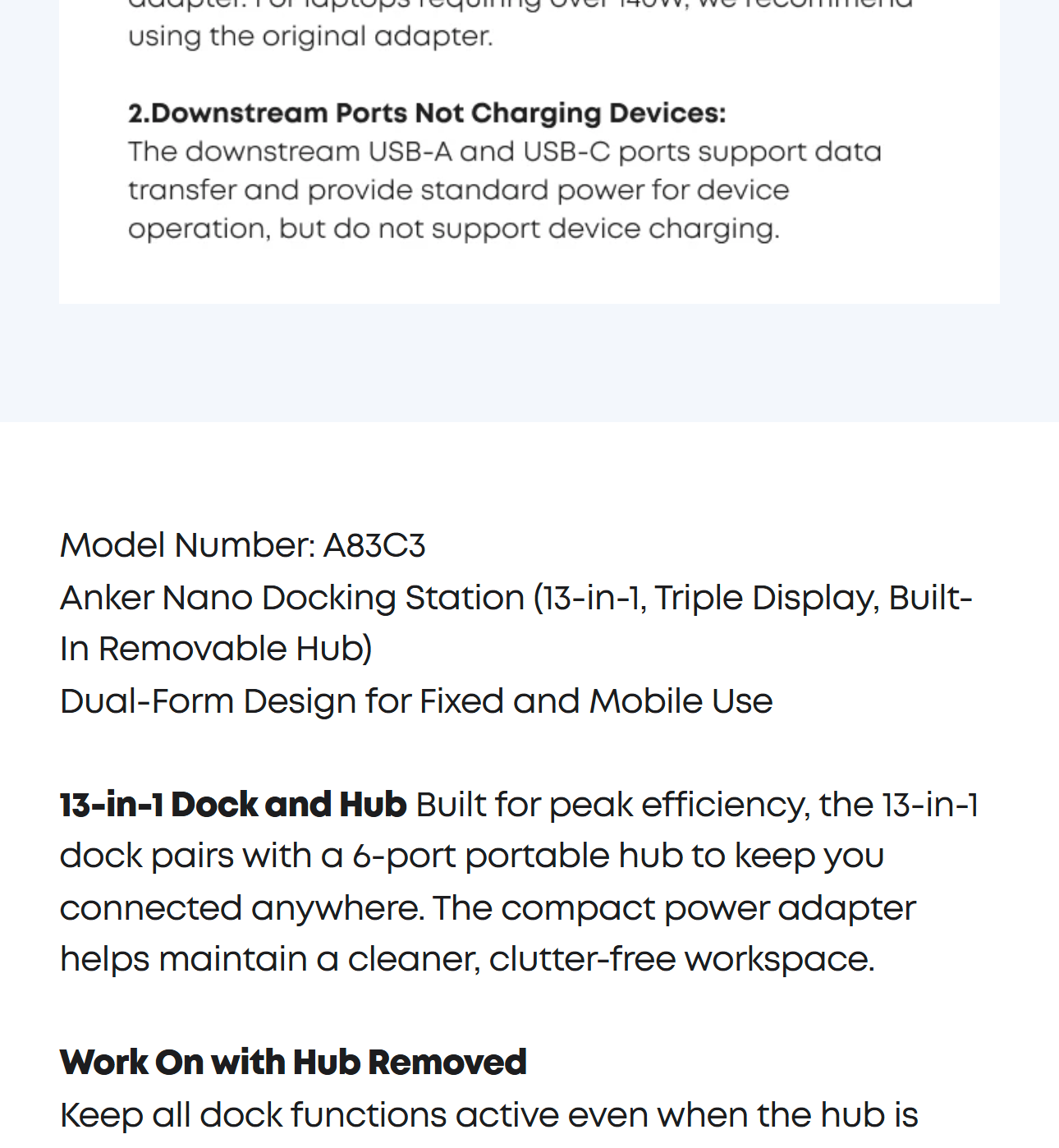 Anker Nano Docking Station (13-in-1, Triple Display, Built-In Removable Hub), 3 ft USB-C to USB-C cable for the upstream port (10 Gbps), a 140W power adapter with a built-in 5 ft power cord, and safety sheet with QR code for the user manual, hassle-free warranty, and our friendly customer service.