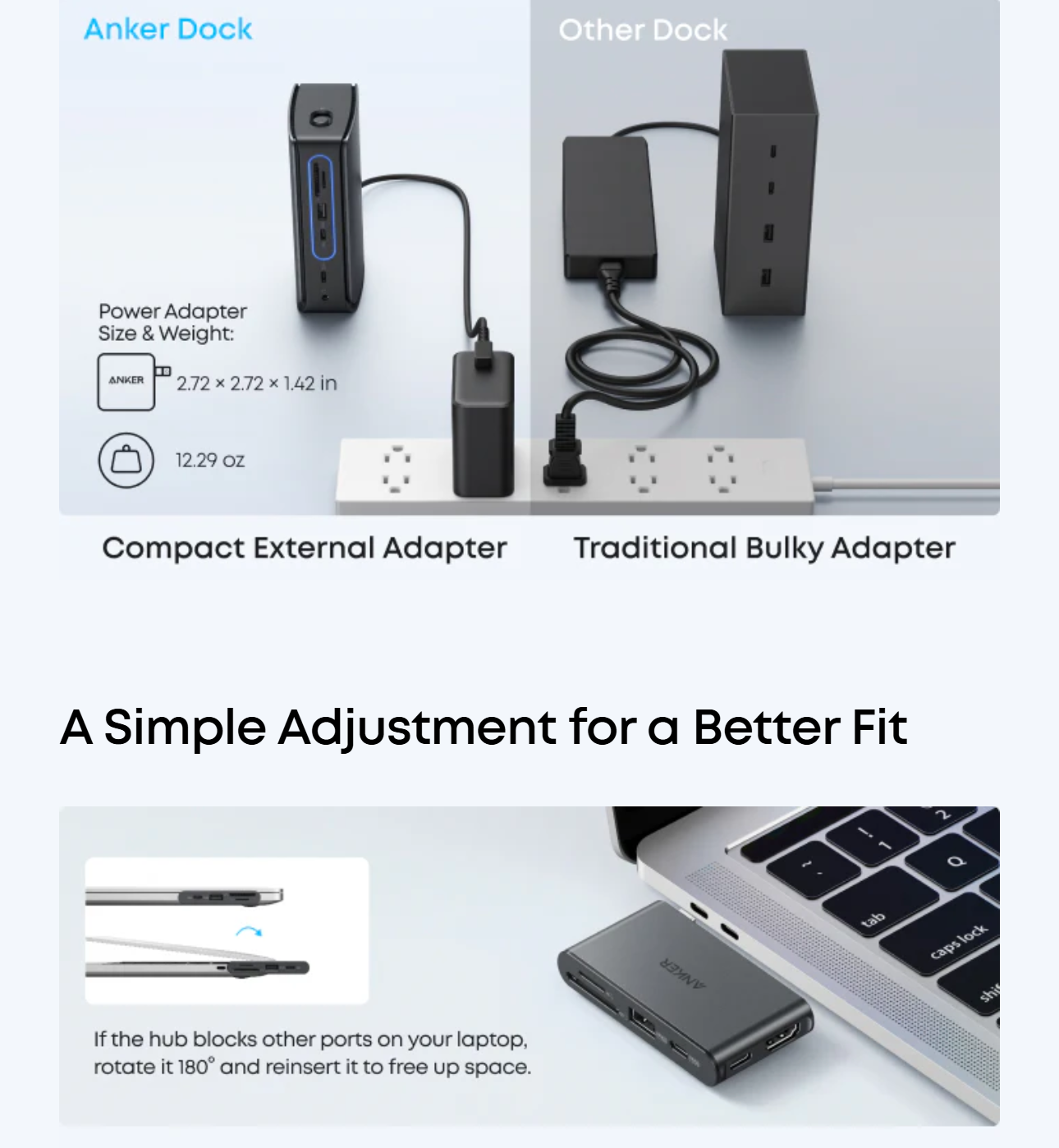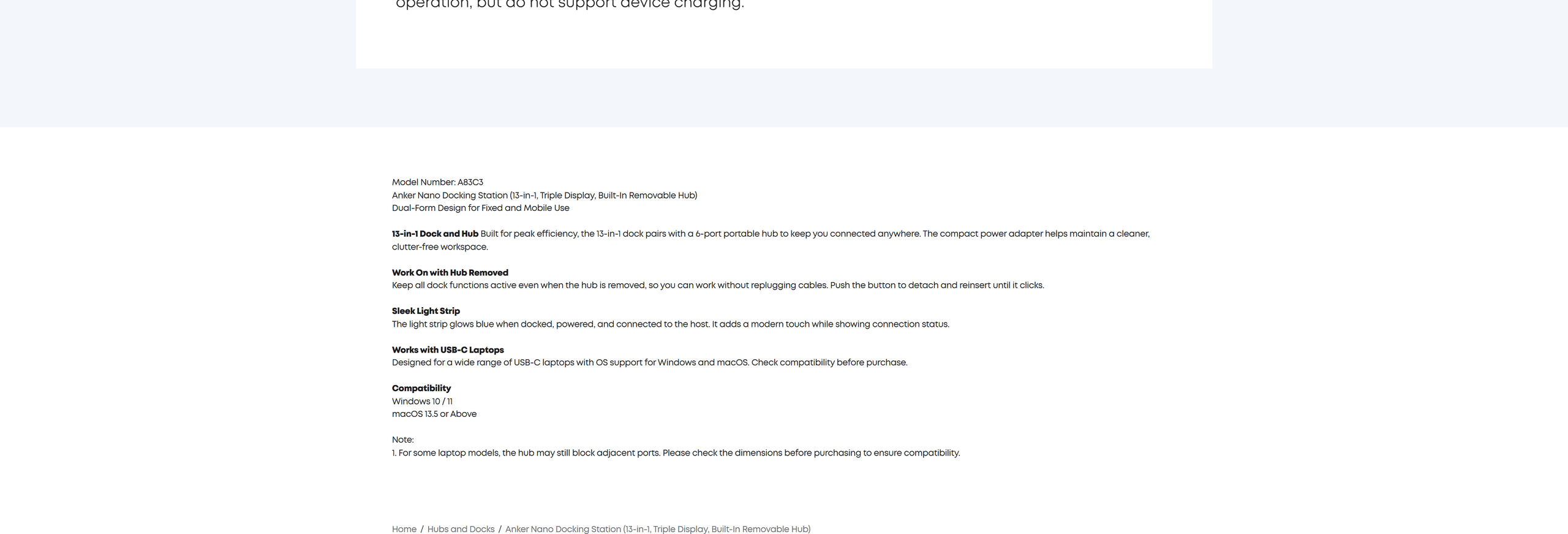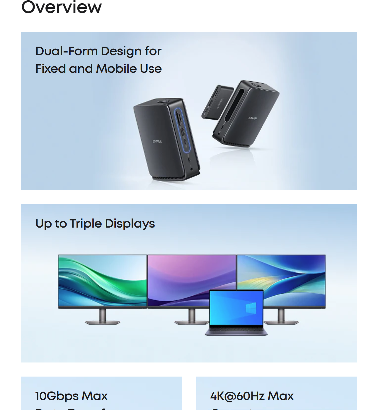 Anker Nano Docking Station (13-in-1, Triple Display, Built-In Removable Hub), 3 ft USB-C to USB-C cable for the upstream port (10 Gbps), a 140W power adapter with a built-in 5 ft power cord, and safety sheet with QR code for the user manual, hassle-free warranty, and our friendly customer service.