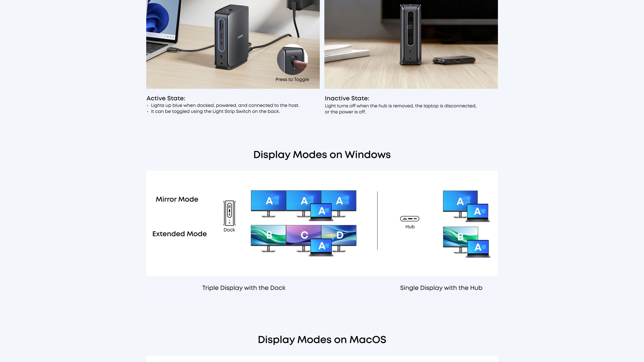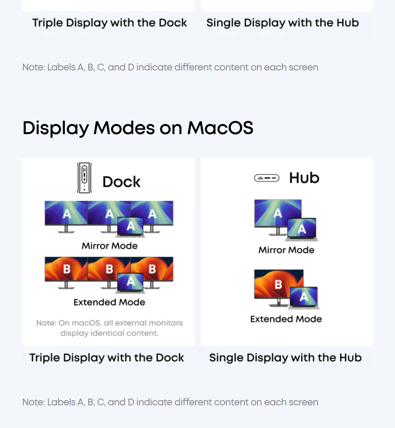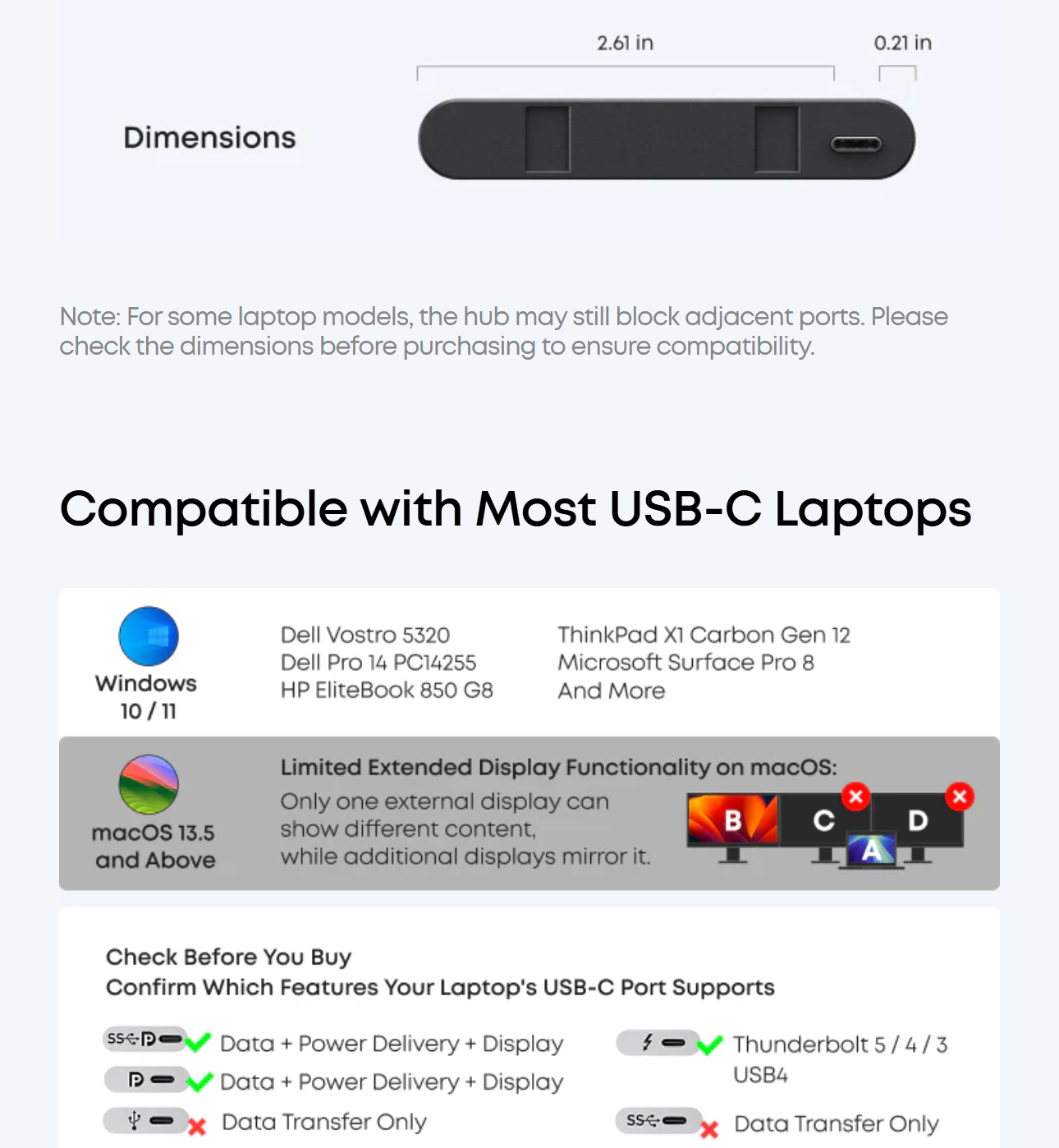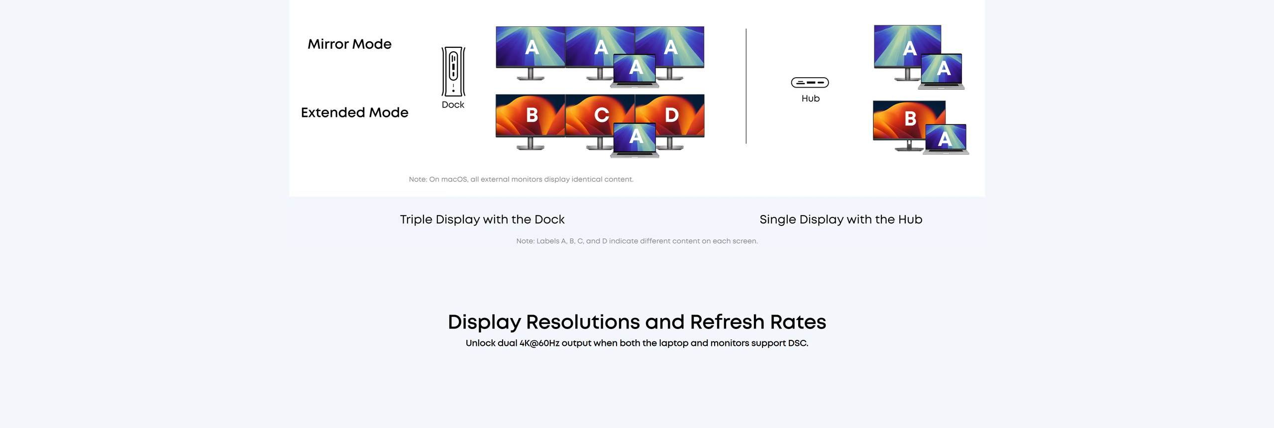 Set up a triple-screen workstation with the dock or connect one display through the hub when working away from your desk. (Note: On macOS, all external monitors mirror the same content. Only the HDMI or DisplayPort supports video output. The USB-C does not support video output.)