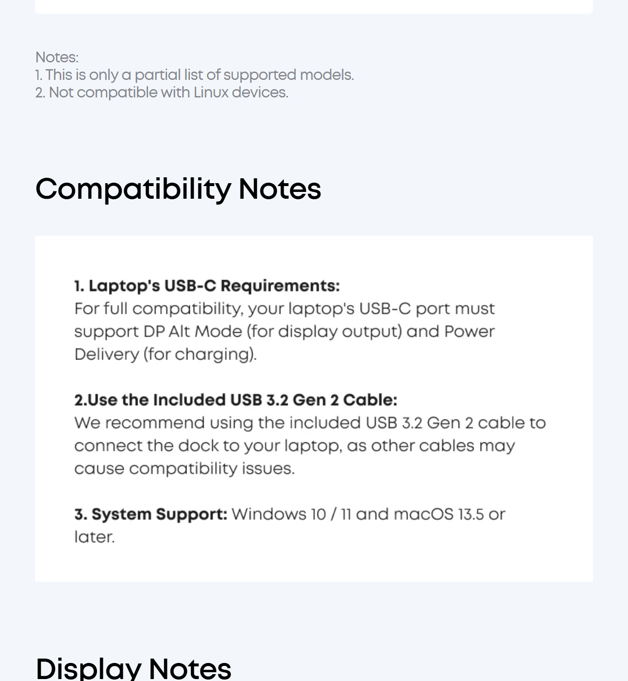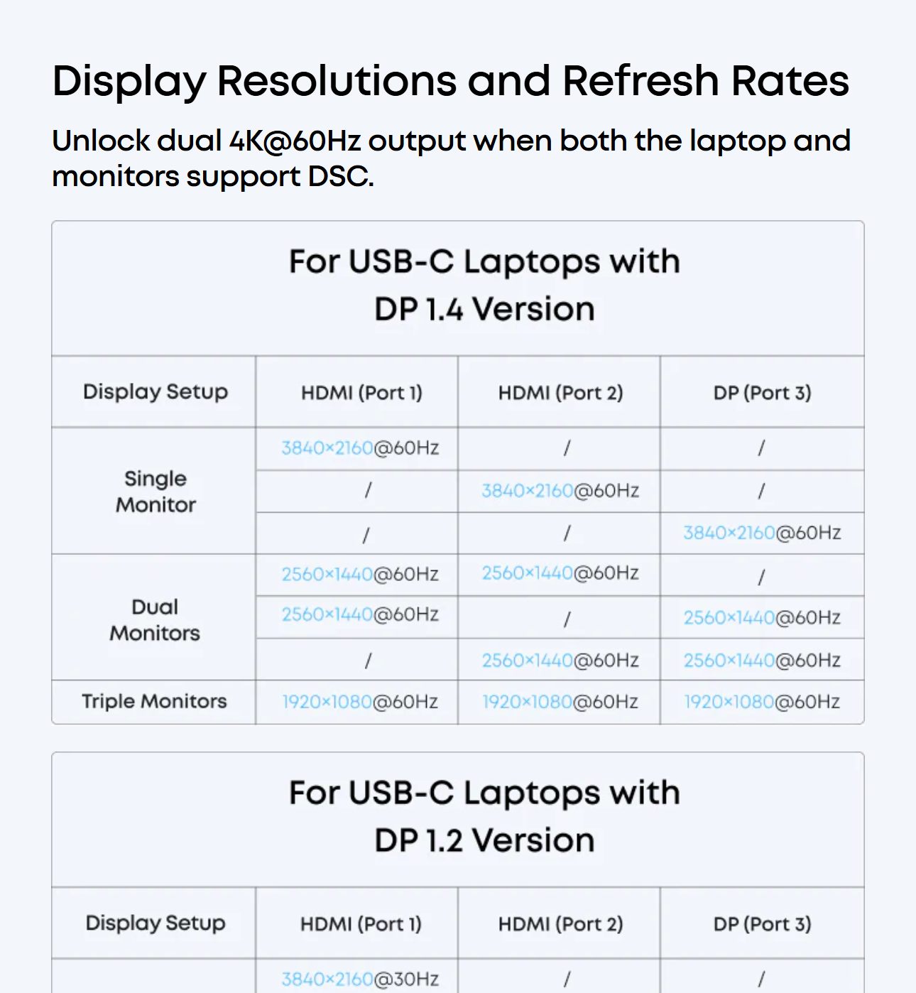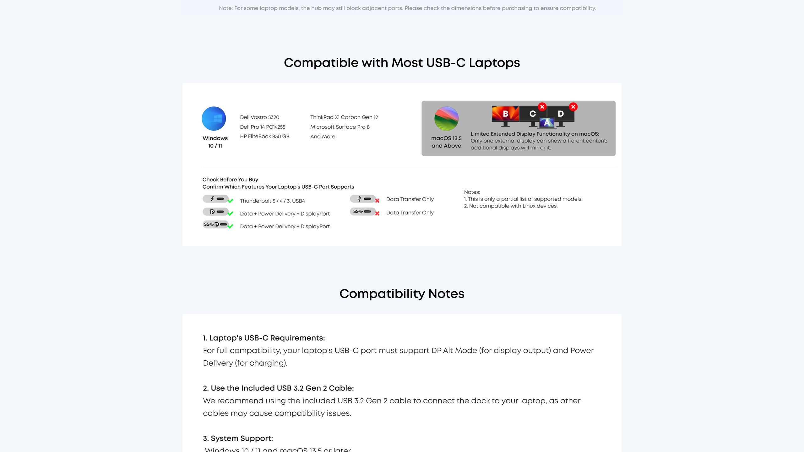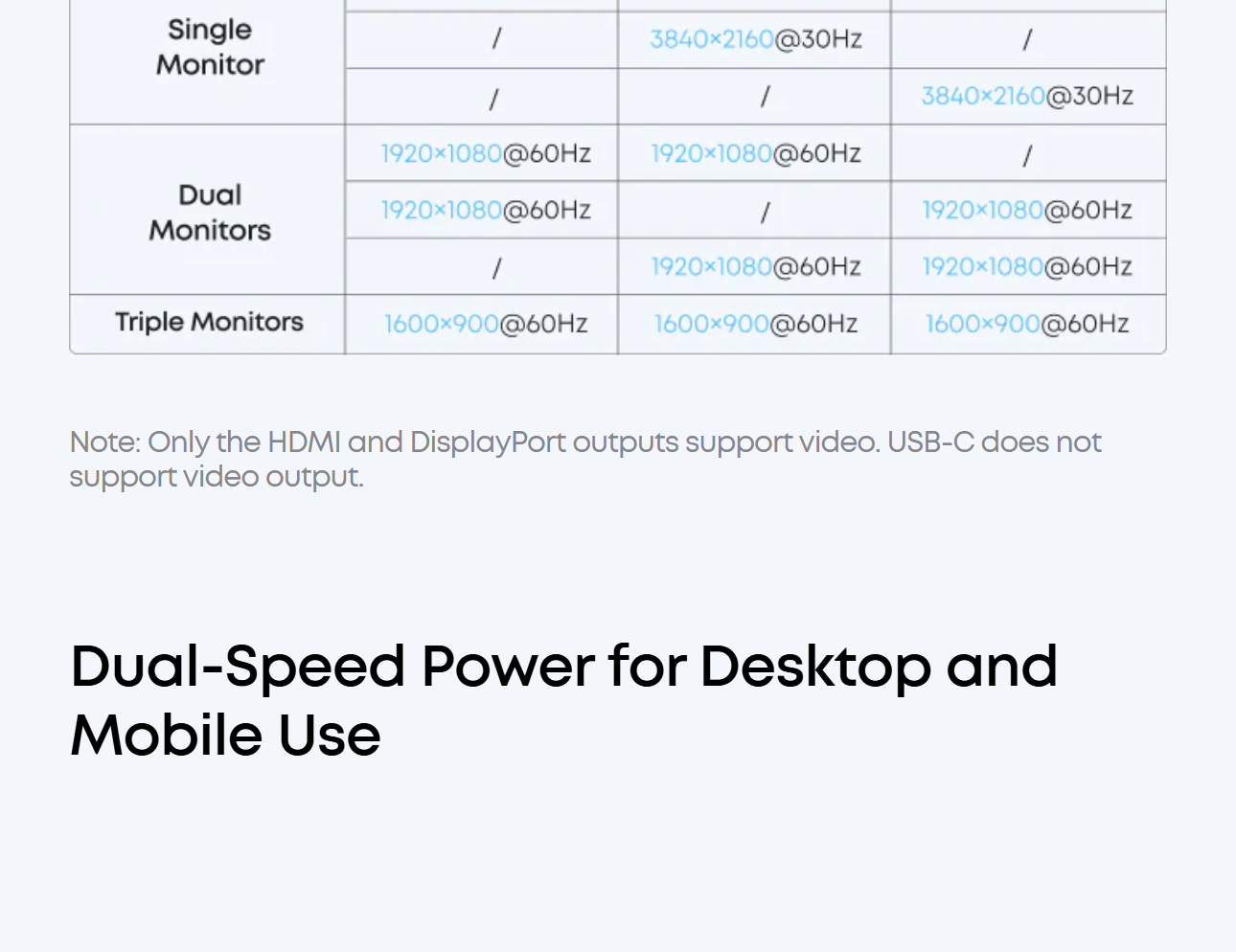 Set up a triple-screen workstation with the dock or connect one display through the hub when working away from your desk. (Note: On macOS, all external monitors mirror the same content. Only the HDMI or DisplayPort supports video output. The USB-C does not support video output.)