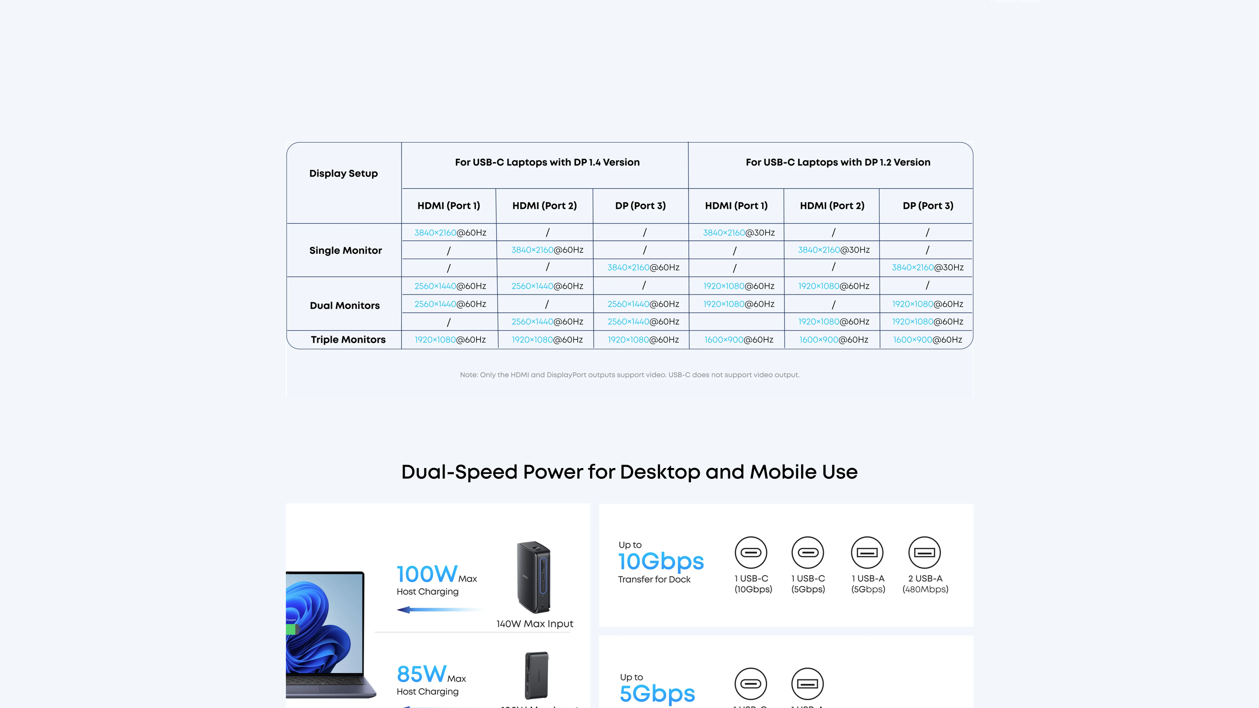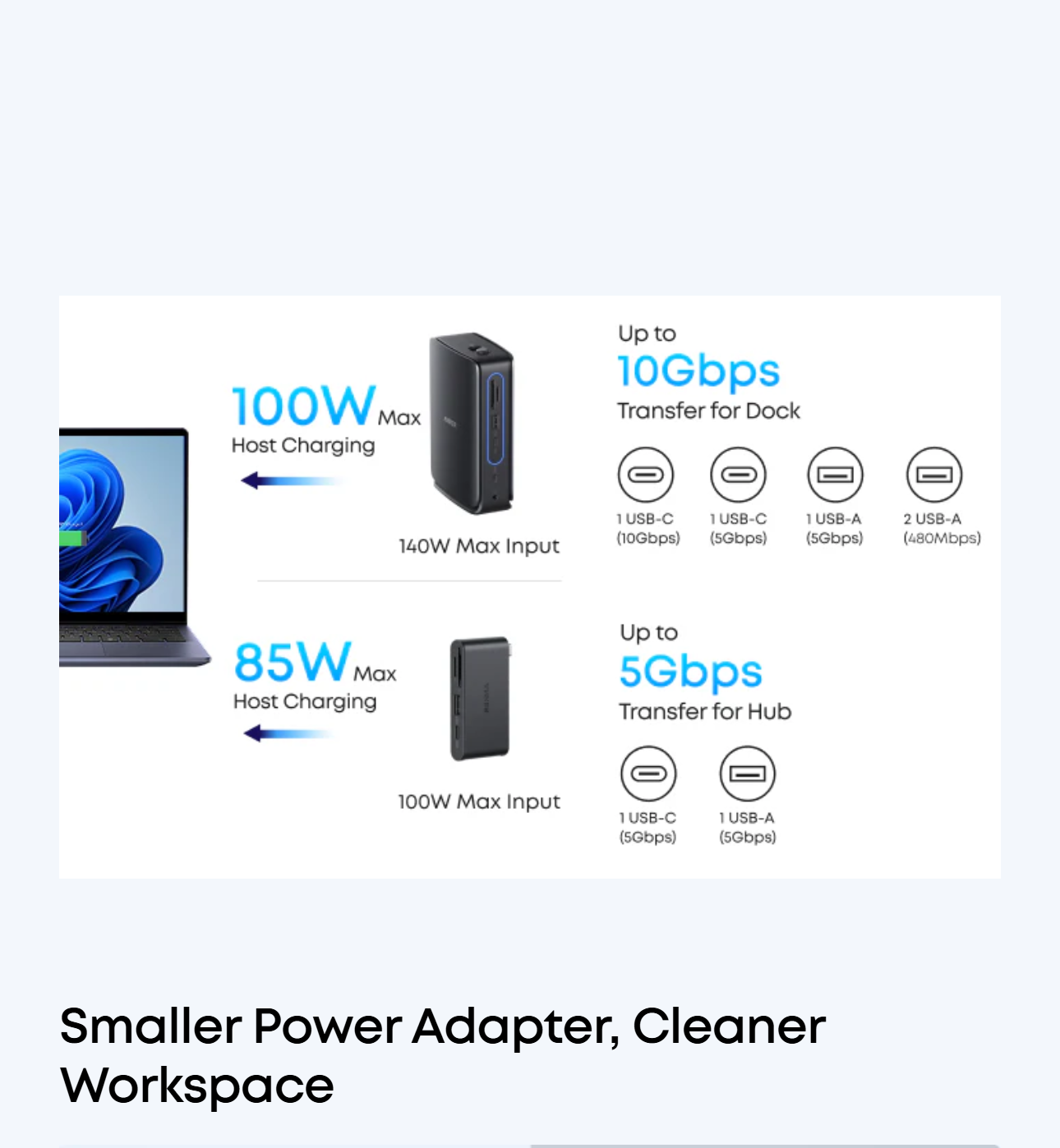 Deliver up to 100W to your laptop while transferring data at speeds up to 10 Gbps via USB-C. The dock supports up to 140W max input from the included power adapter to maintain stable power for all connected devices.