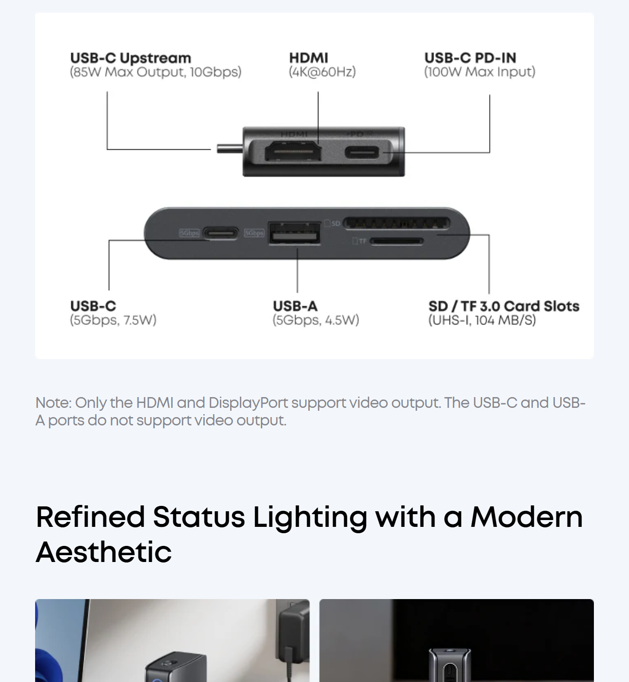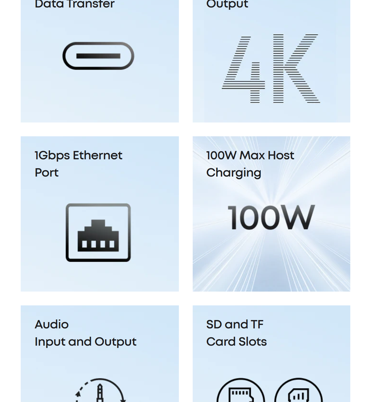 Features a USB-C upstream port, two USB-C data ports, three USB-A data ports, dual HDMI and DisplayPort outputs supporting up to 4K resolution, an Ethernet port, audio jack, SD and TF card slots, and a DC input port. The detachable hub adds essential ports for convenient access on the go.