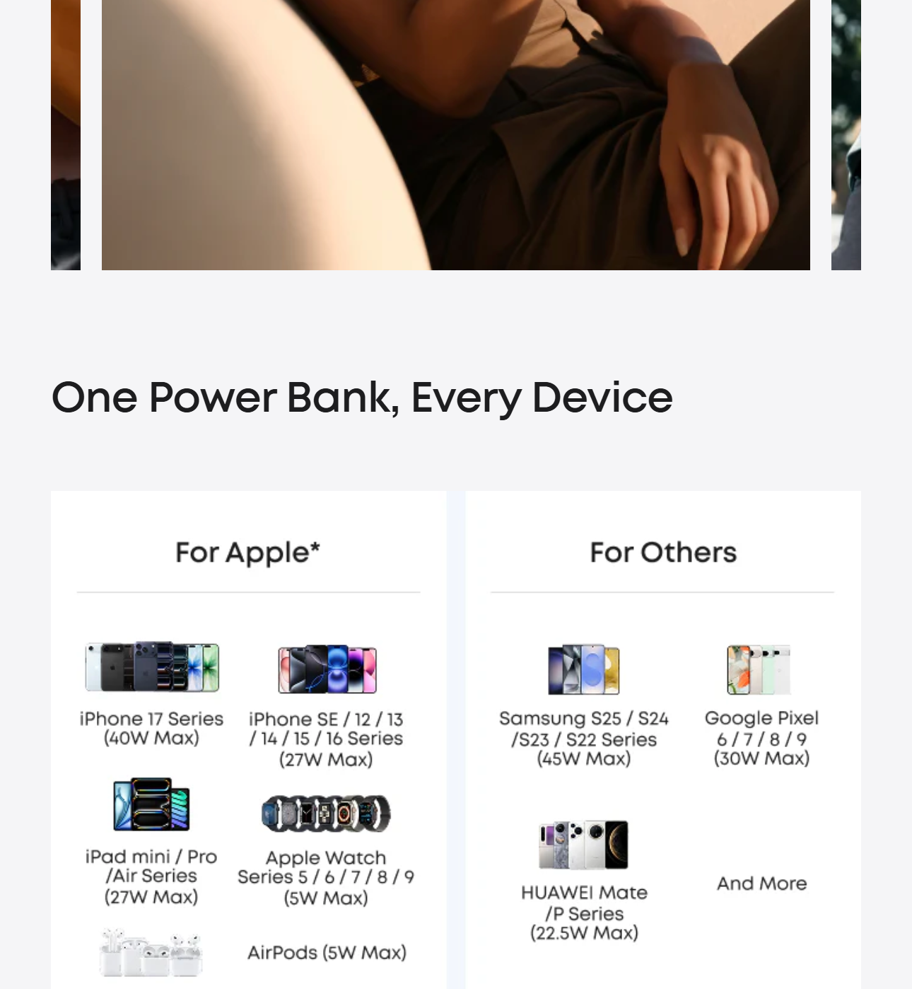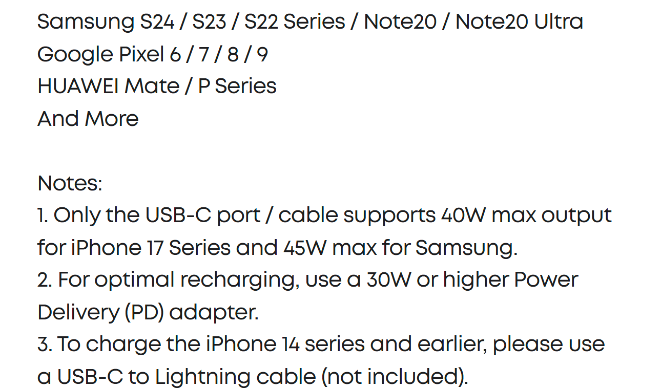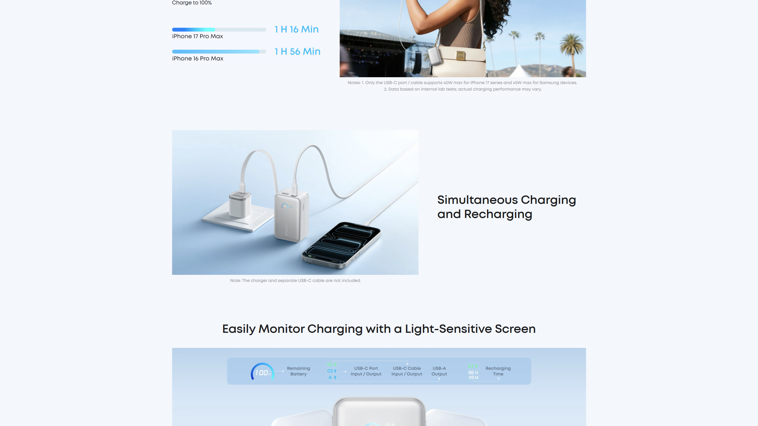 Enjoy simultaneous charging and recharging with a 45W max single-port USB-C output for devices and a 30W max input for quick power bank replenishment. Charge an iPhone 17 Pro to 50% in 20 minutes and recharge the power bank to 100% in 2 hours.