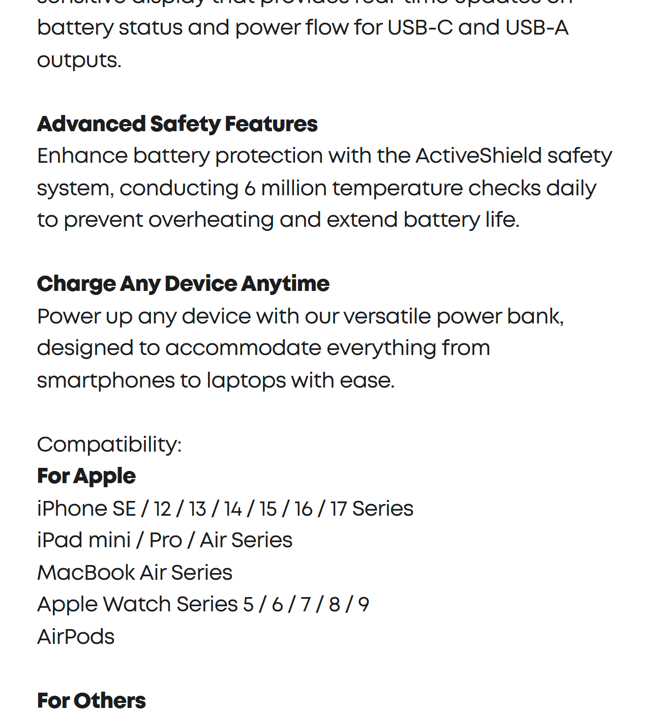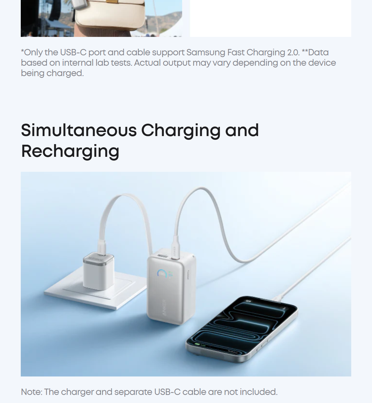 Equipped with a huge 10,000mAh capacity, fast 45W max charging, pass-through technology, an intelligent display, and 24/7 battery protection for safe, efficient power anytime. The USB-C cable / port is compatible with Samsung Fast Charging 2.0.