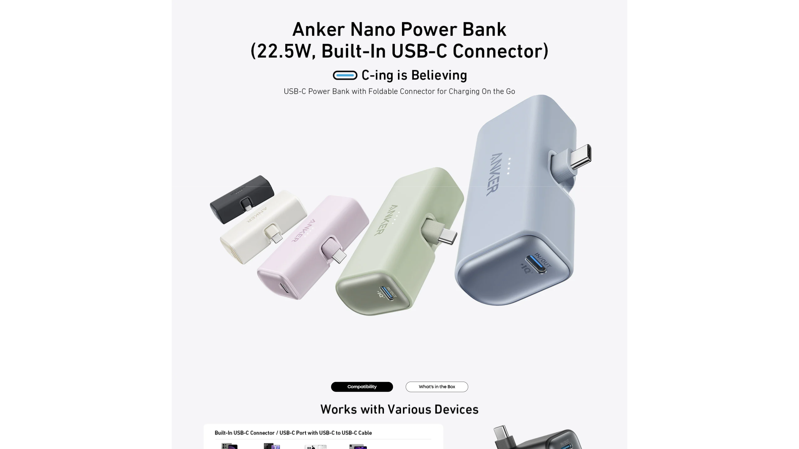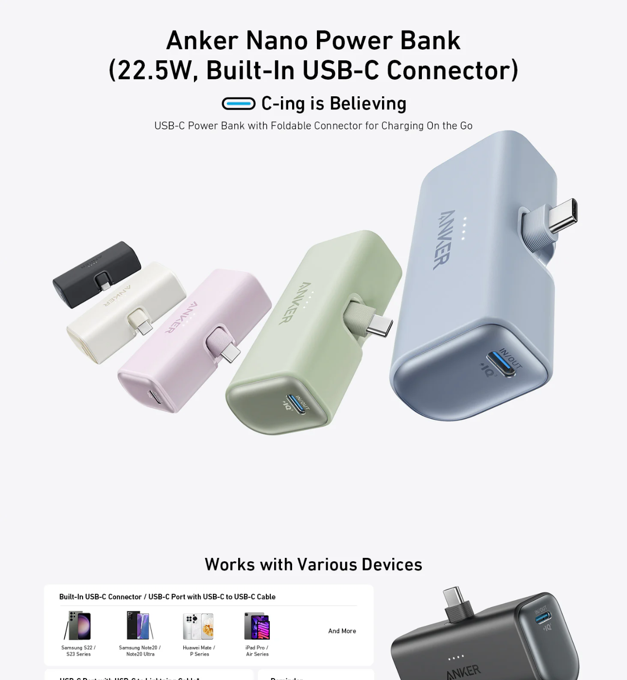 Anker Nano Power Bank (22.5W, Built-In USB-C Connector), 2 ft / 0.6 m USB-C to USB-C cable, welcome guide, user manual, 24-month worry-free warranty, and our friendly customer service.