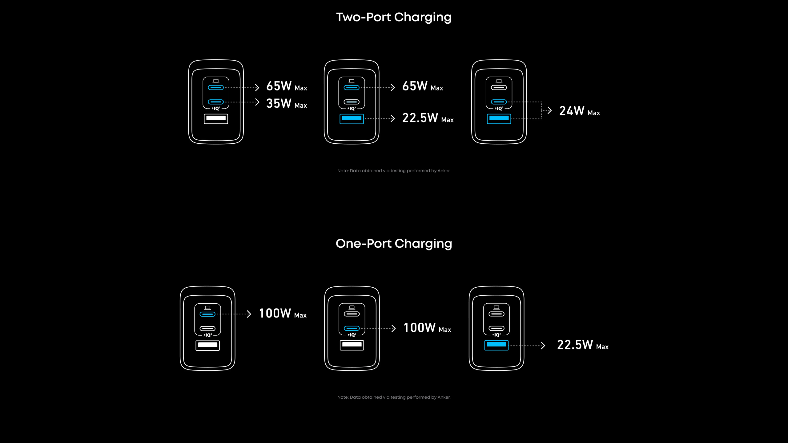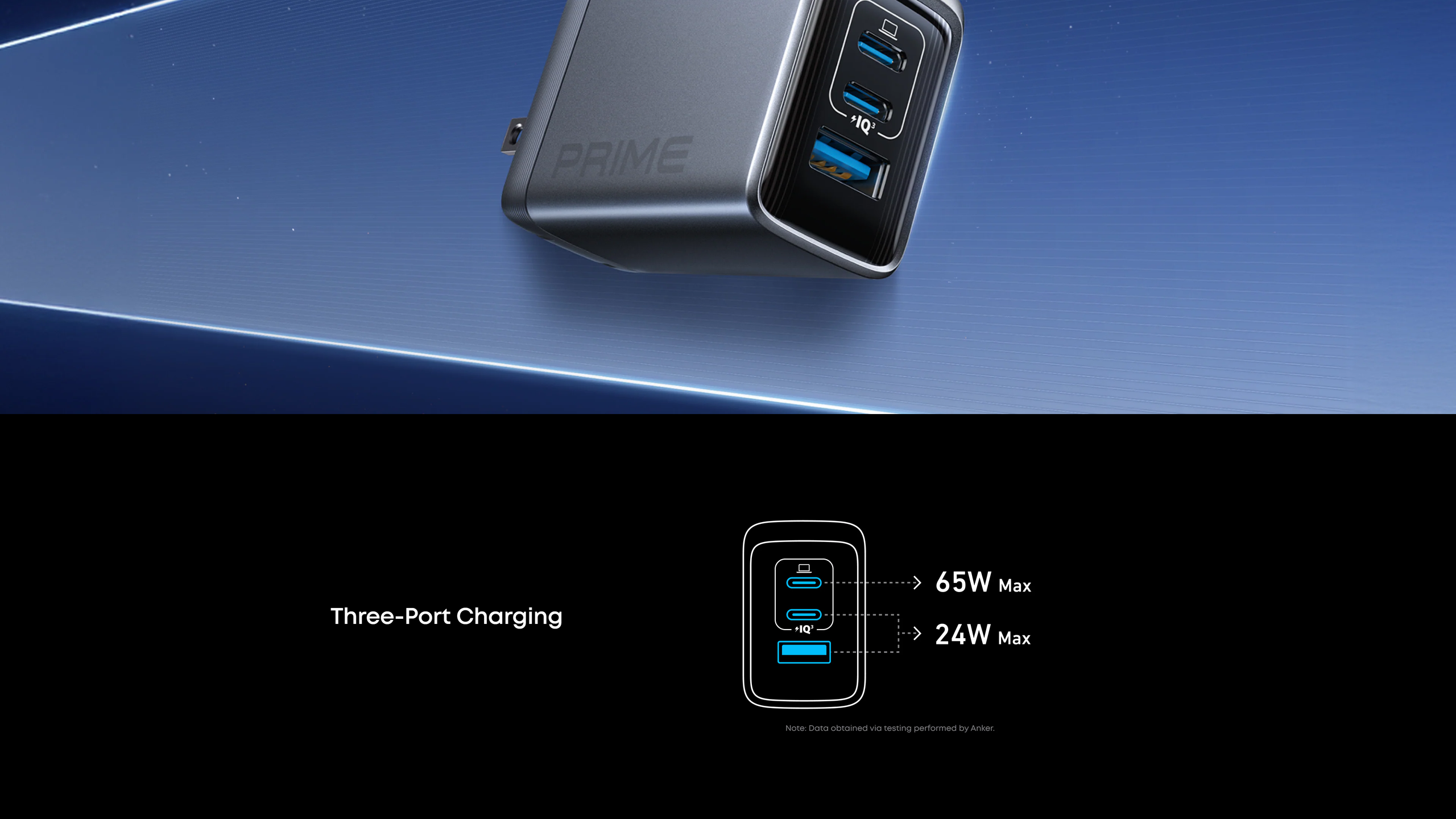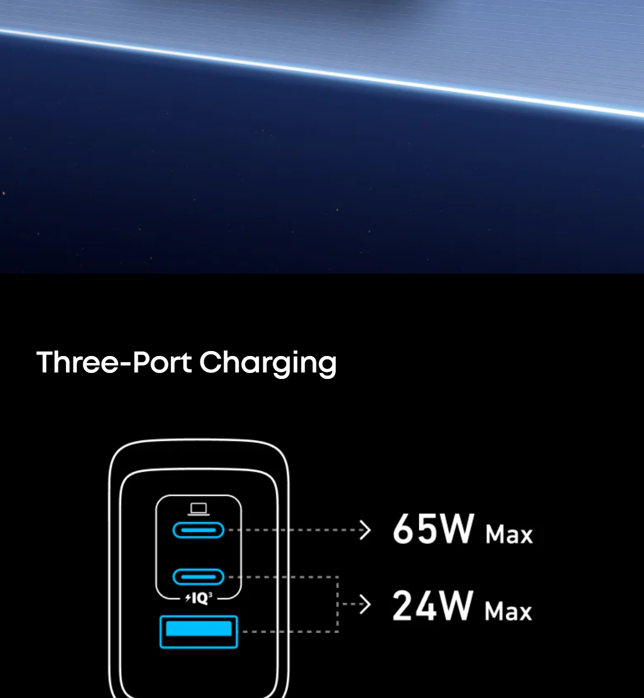 Power up three devices simultaneously with a total of 100W output through two USB-C and one USB-A port for efficient power distribution.