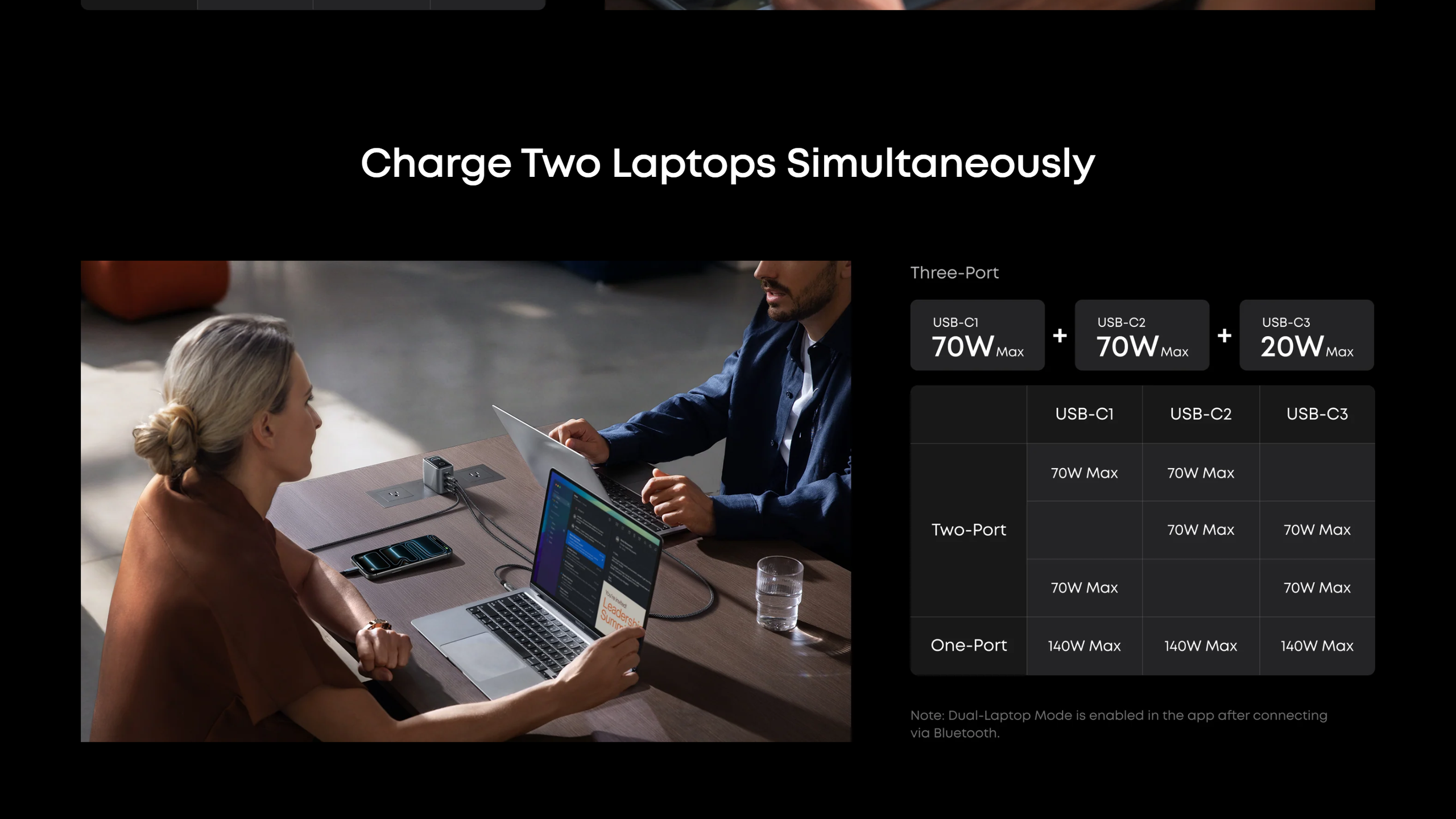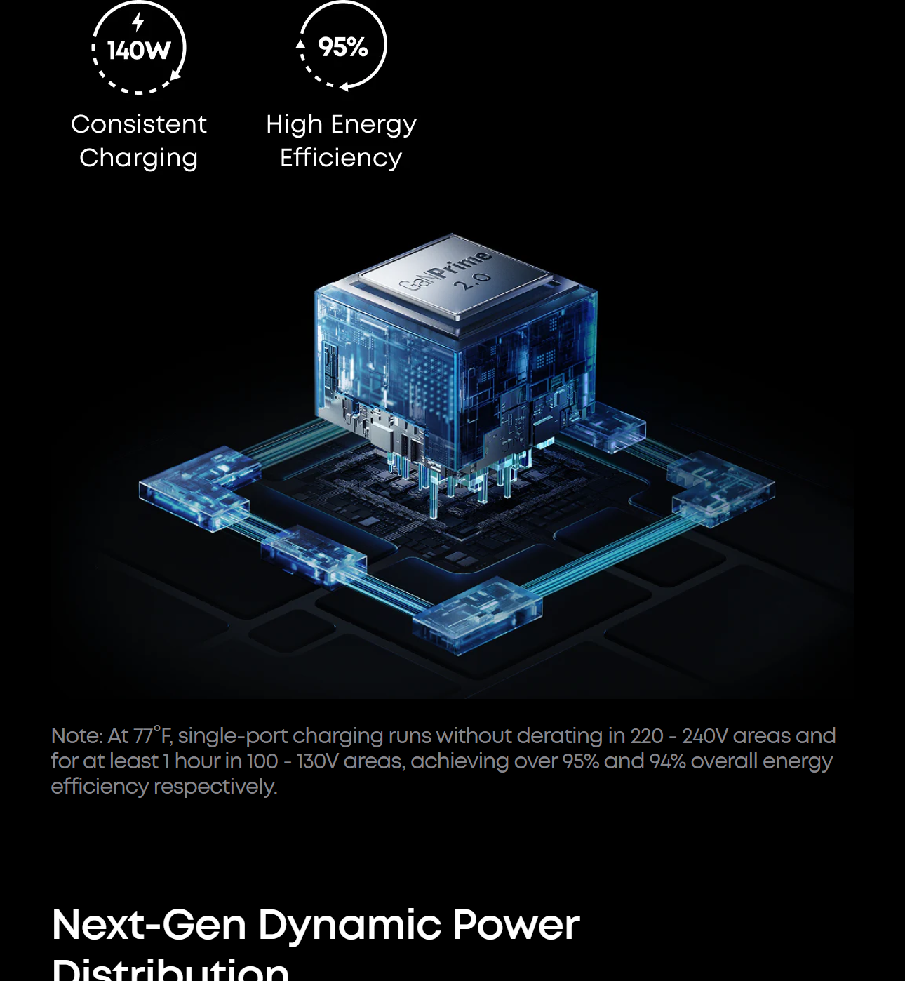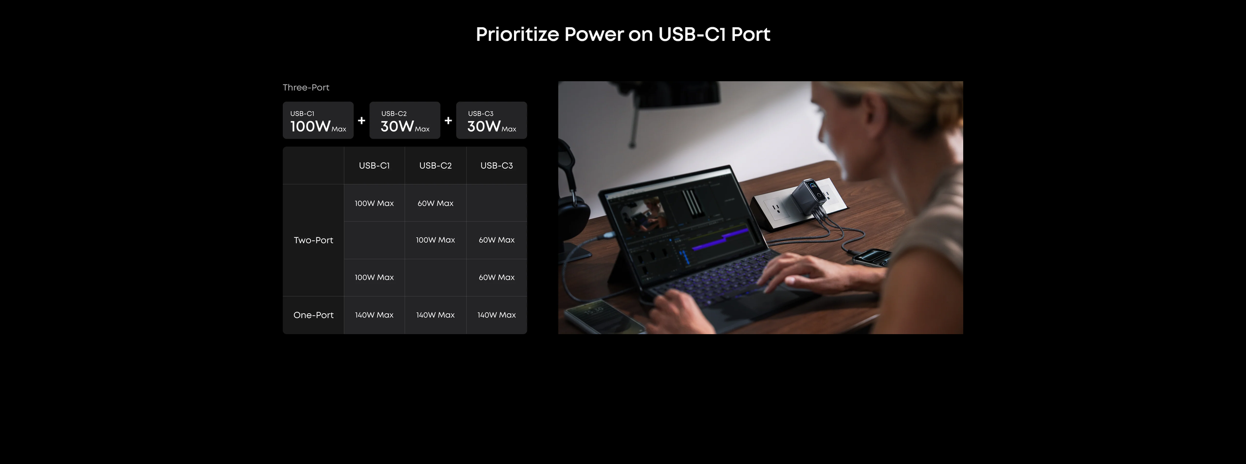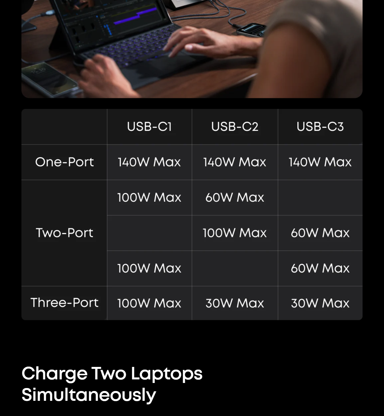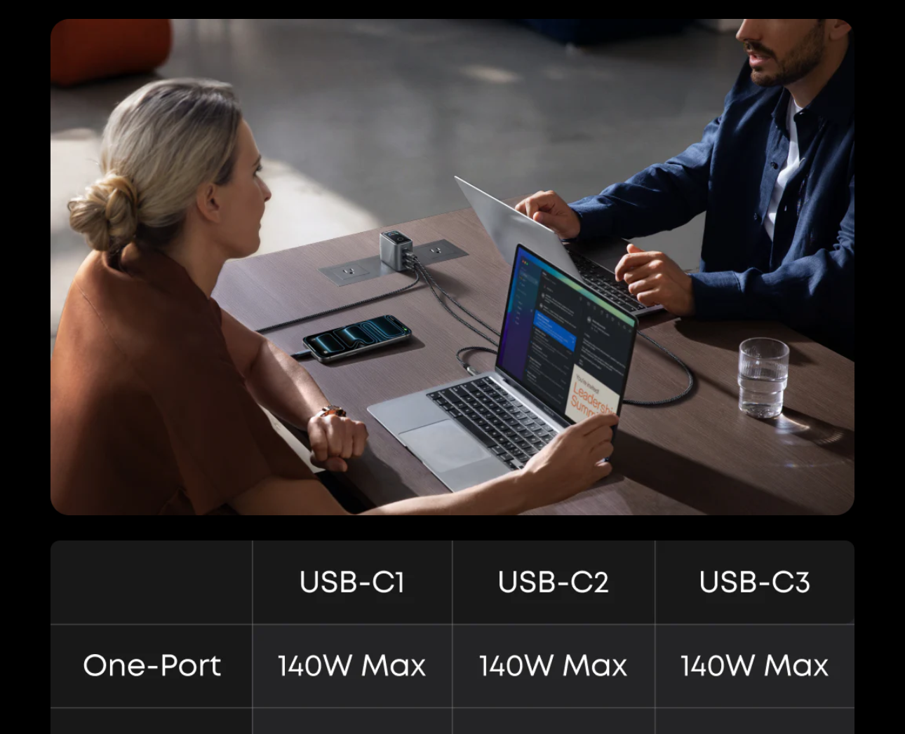 Enjoy a consistent 140W single-port output without derating, keeping laptops charging at maximum speed even during long work sessions or heavy loads. Charge a 16-inch MacBook Pro from 0 to 50% in just 25 minutes, without worrying which port to use.