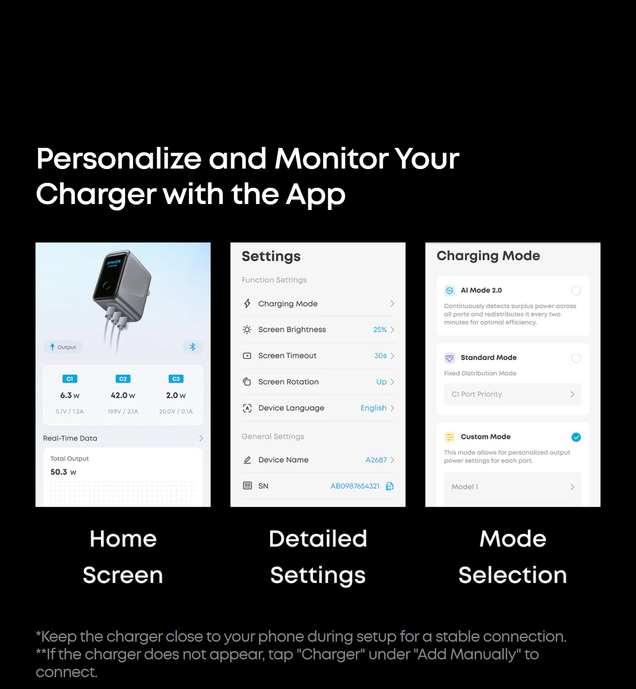 With AnkerSense View, monitor power in real time on screen, switch modes instantly, and unlock custom modes through the app via Bluetooth.