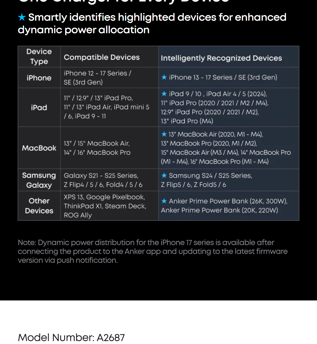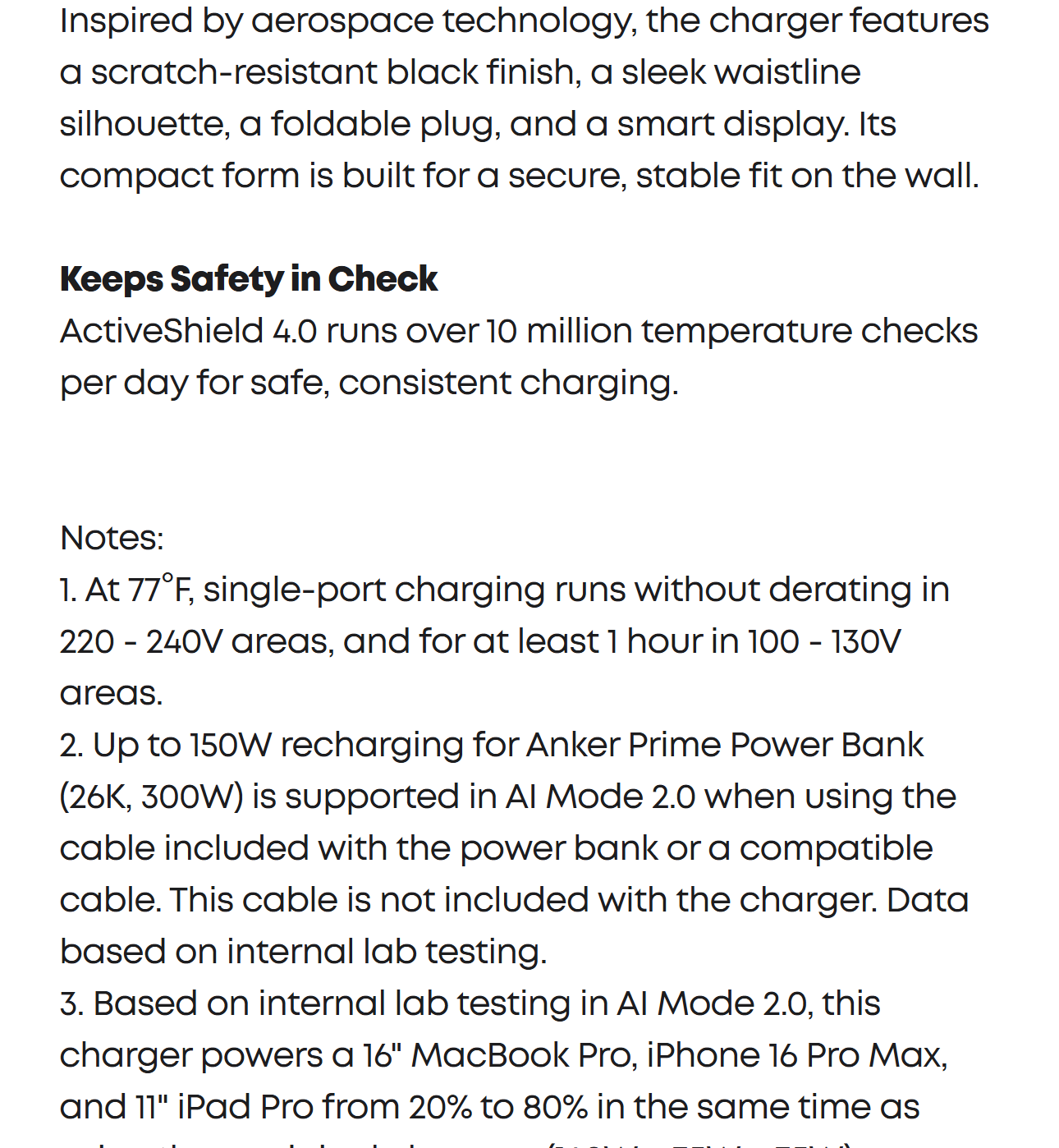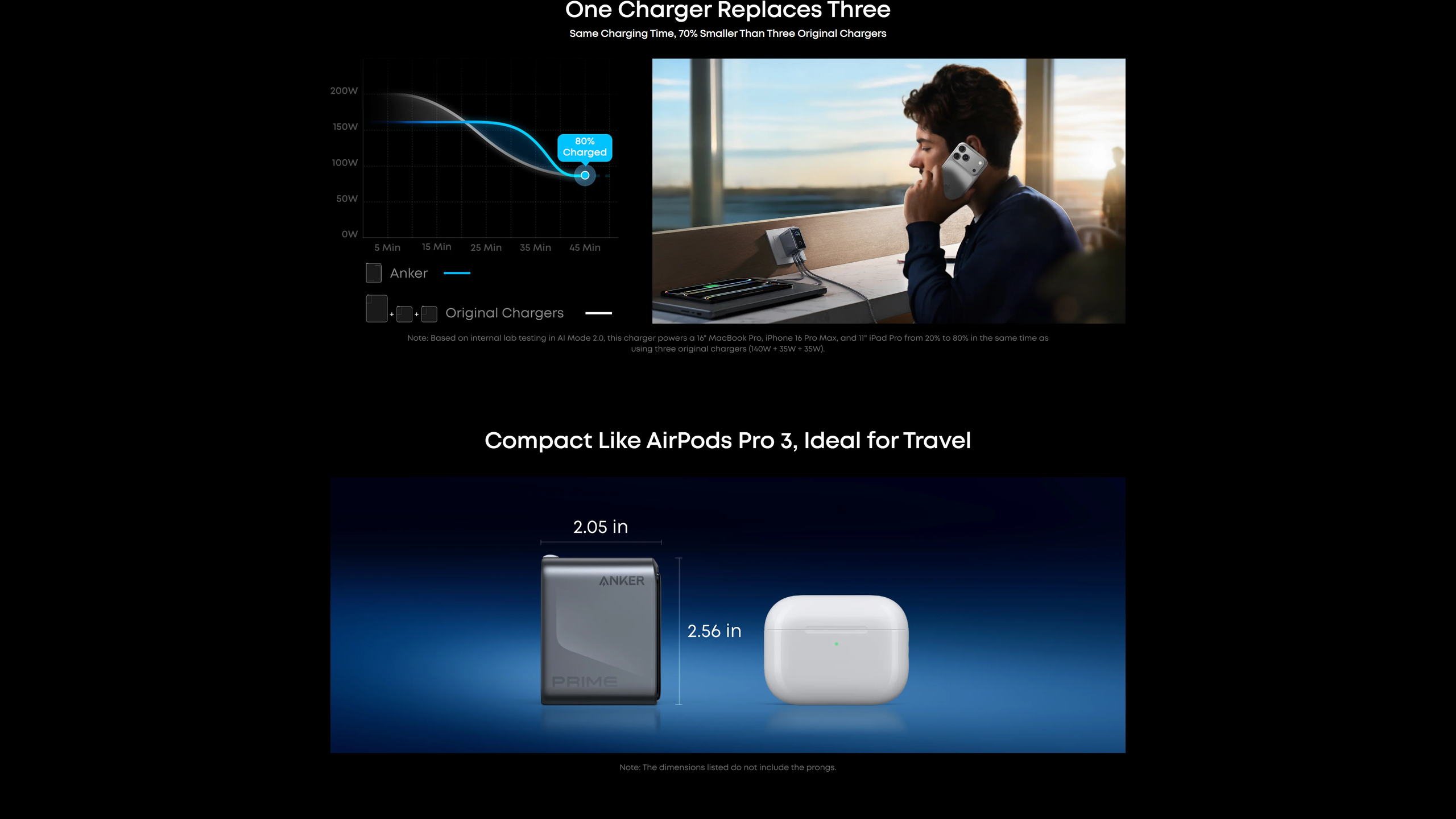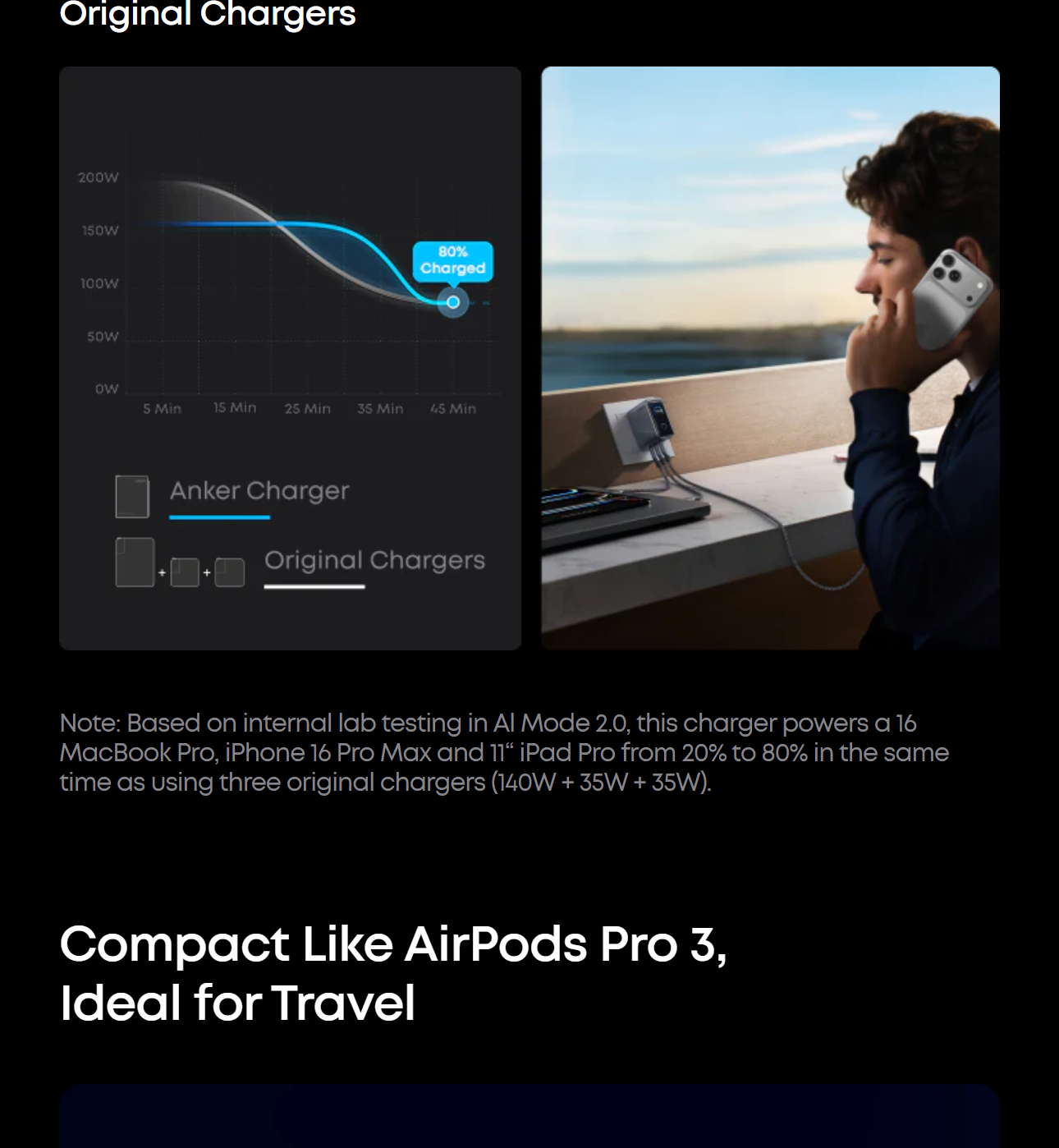 With smart power distribution powered by PowerIQ 5.0, power a 16" MacBook Pro, iPhone 16 Pro Max, and 11" iPad Pro in the same time as three original chargers (140W + 35W + 35W). Carry one instead of three and stay fully productive on the go.