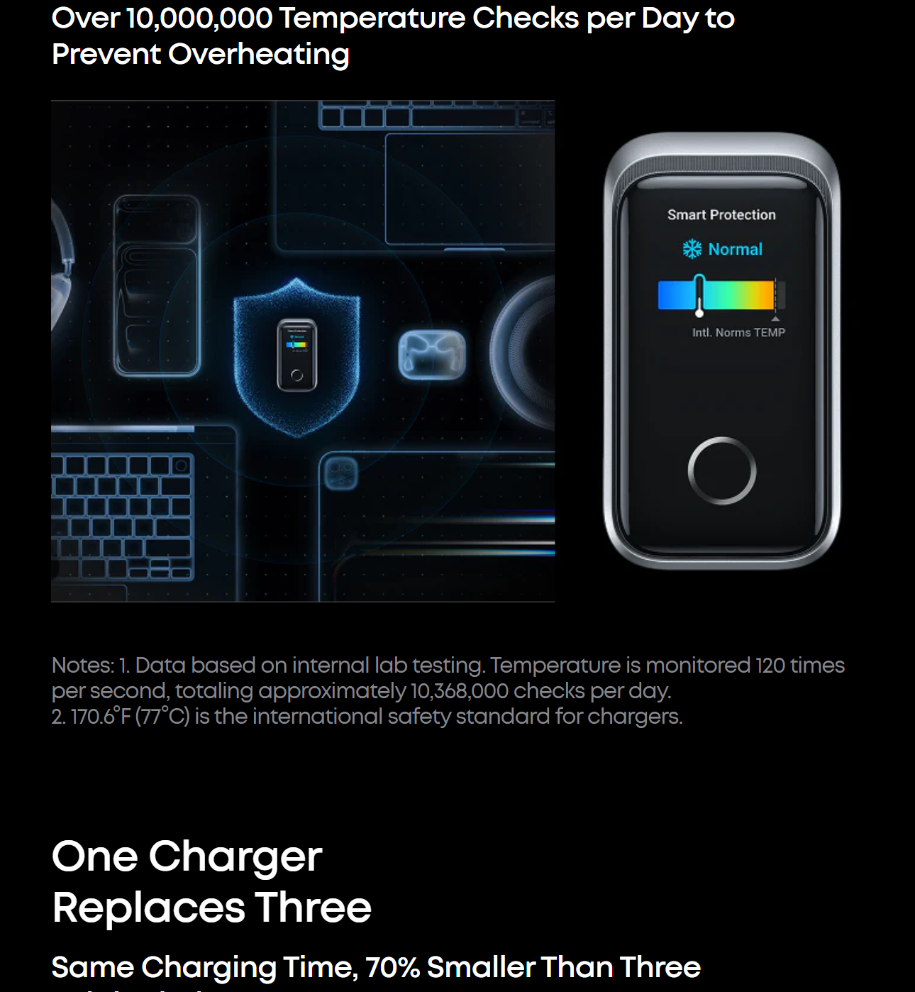 Delivering 1.35W/cm³ of power density, this sleek 3-port USB-C charger provides a total output of 160W while being as compact as an AirPods Pro 3 case, making it easy to carry yet powerful enough to handle your devices.