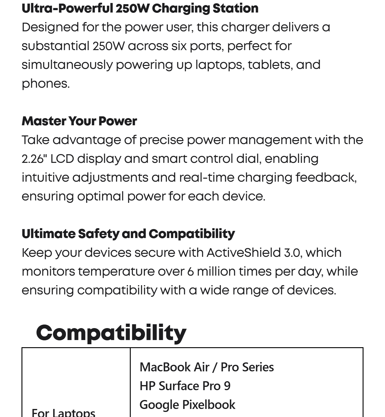 Monitor your charging in real time with the 2.26-inch LCD charger display built into this powerful desk charger, providing clear feedback on charging status and speed.
