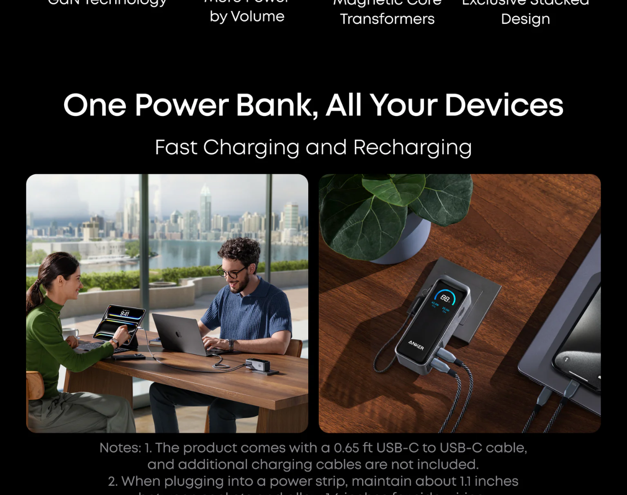 Delivers up to 65W output, ideal for rapidly charging laptops in battery or charger mode. Note: Maximum output of 65W is available only when using a single port. When multiple ports are in use, the USB-C1 port provides up to 45W, and the USB-C2 port provides up to 20W.