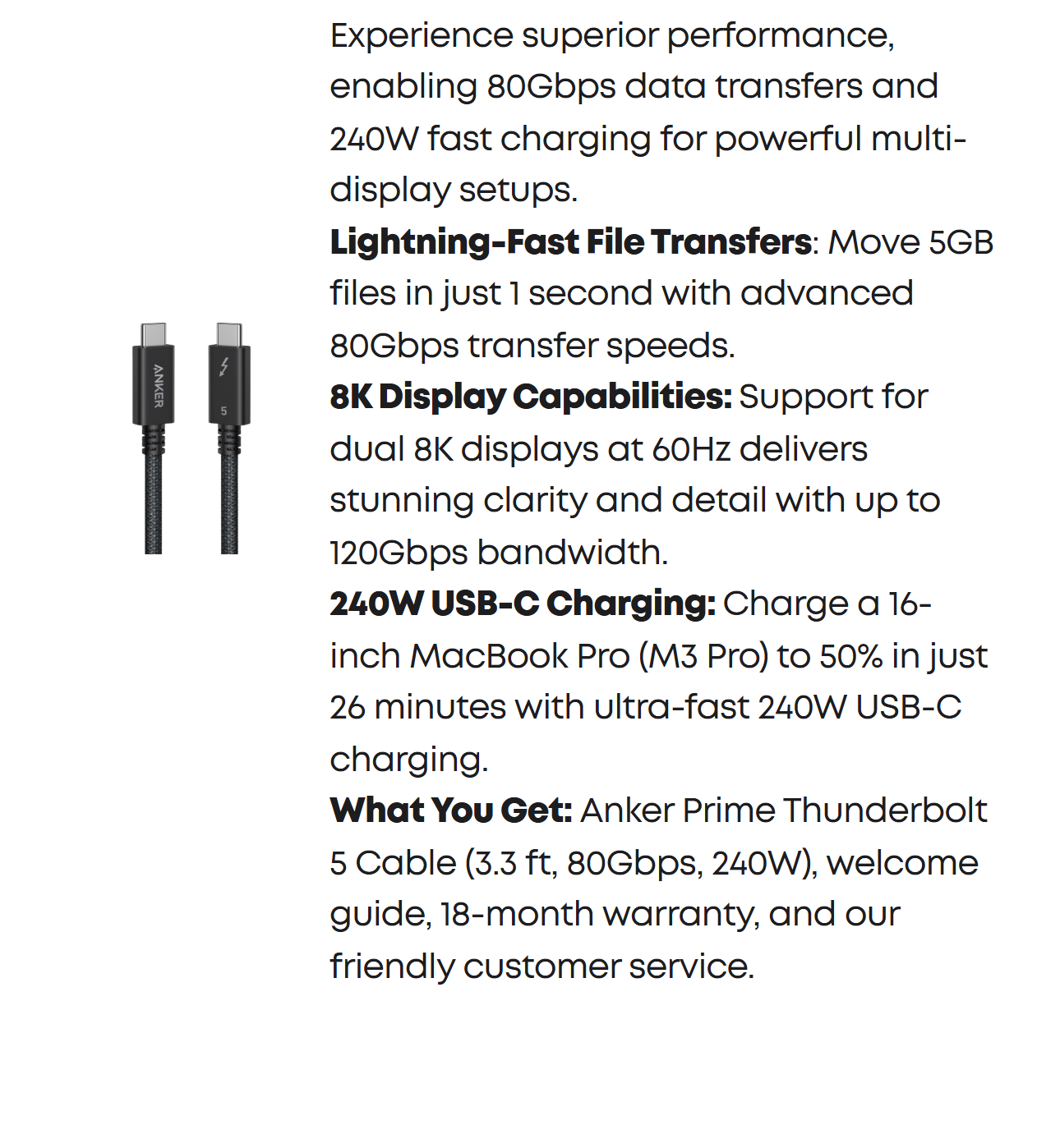 Anker Prime Docking Station (14-in-1, 8K, Thunderbolt 5), 3.3 ft Thunderbolt 5 cable, 6 ft AC power cable, Anker Prime Thunderbolt 5 Cable (3.3 ft, 80Gbps, 240W, Free Gift), 24-month warranty, safety sheet with QR code for user manual, and our friendly customer service.