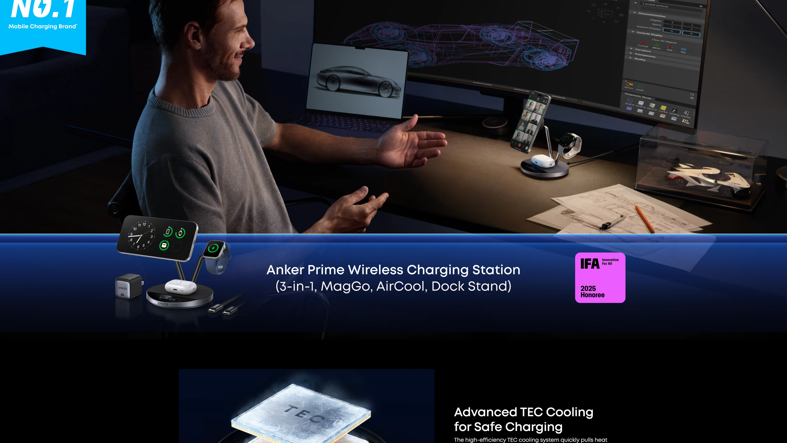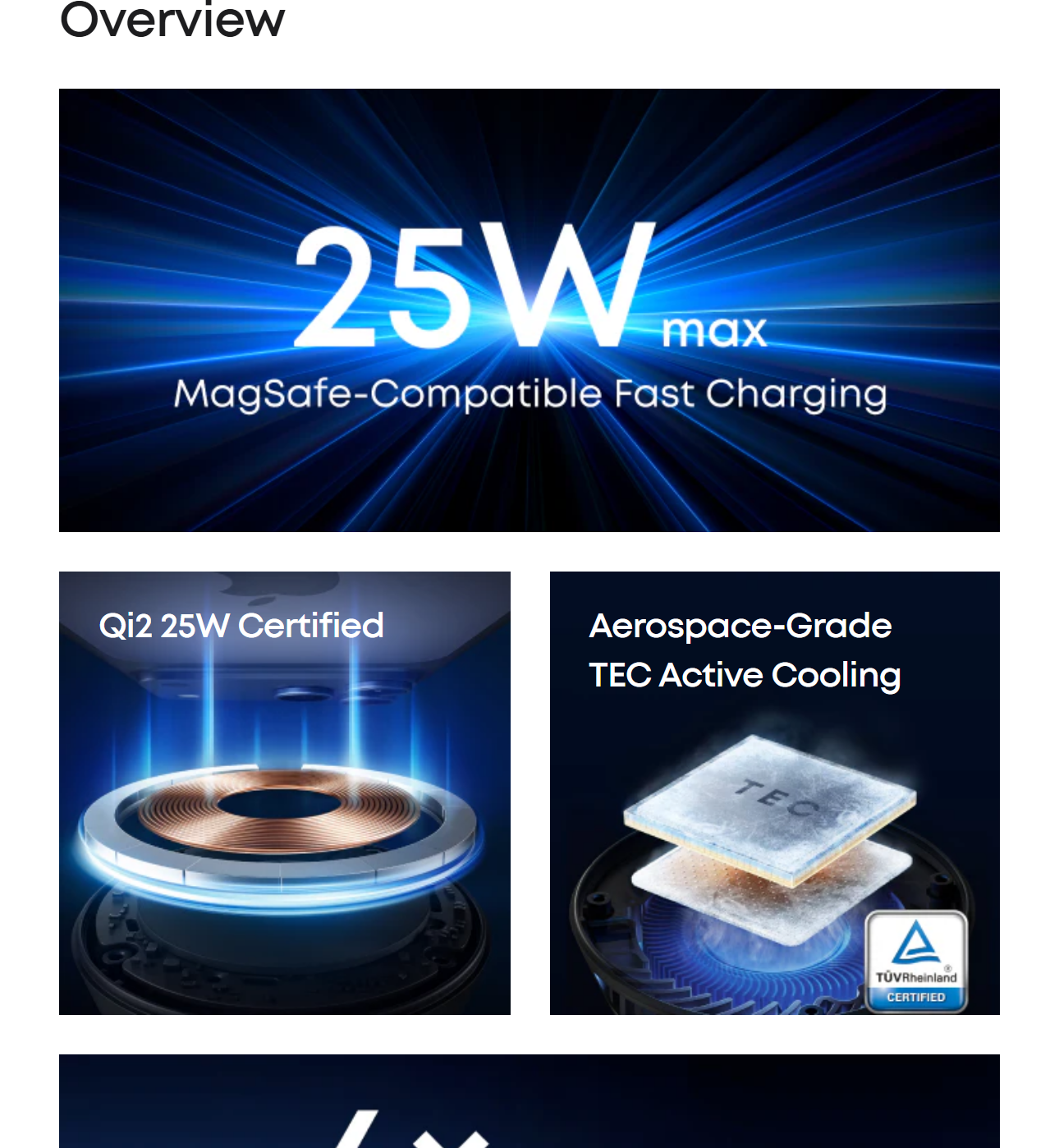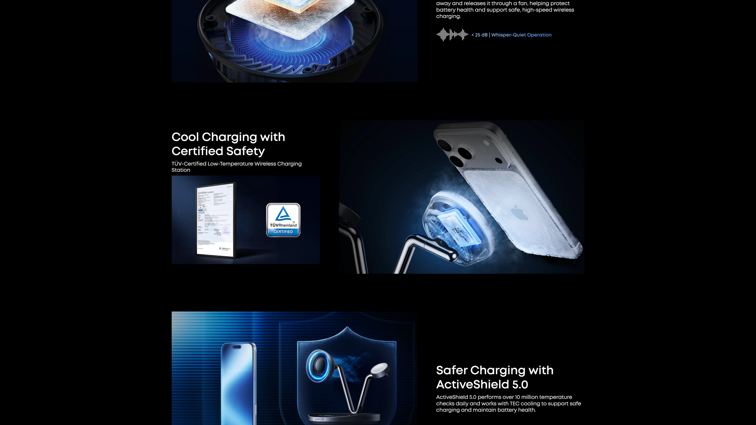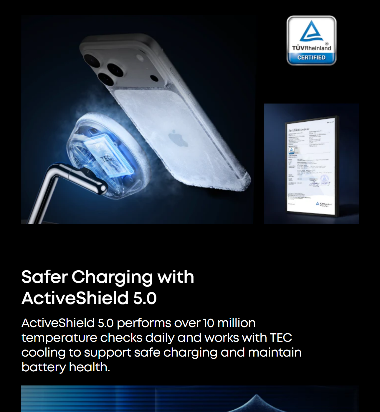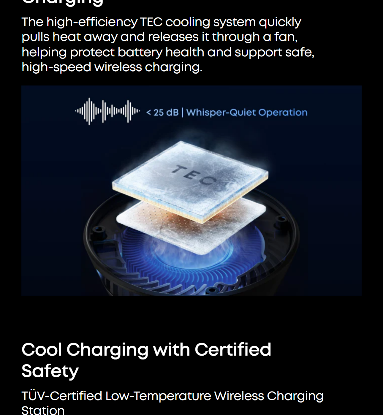 Thanks to TEC active cooling, your phone stays below 89°F while charging, providing a safe, efficient, and comfortable experience. Lower temperatures help protect your battery's health and reduce long-term degradation. Actual performance may vary.