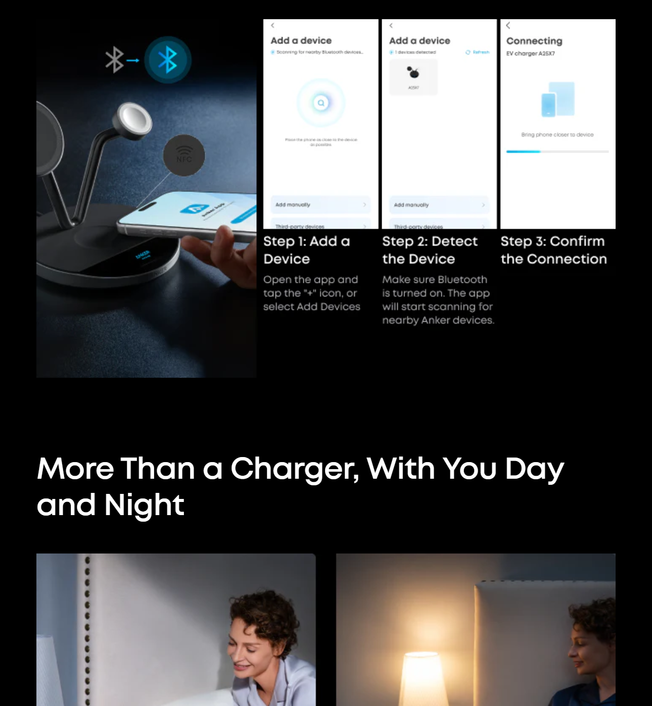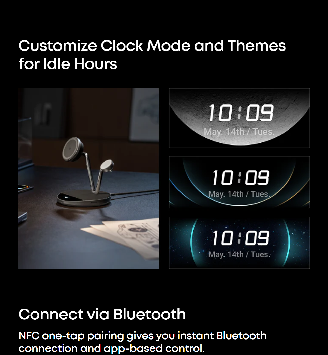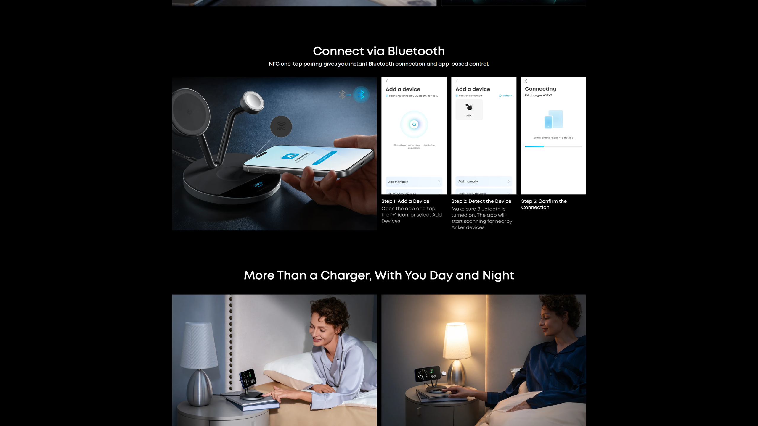 Connect via NFC or Bluetooth in the Anker app to check charging status, switch modes, schedule day or night cycles that automatically enter or exit Sleep Mode, set screensavers, and more. With NFC quick launch, a single tap connects you instantly.