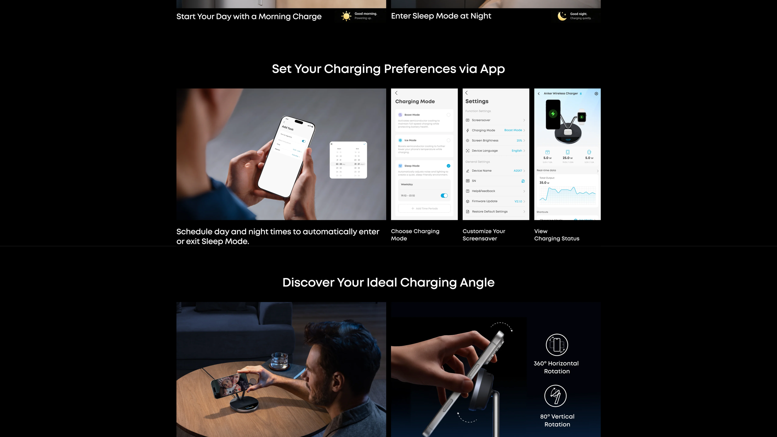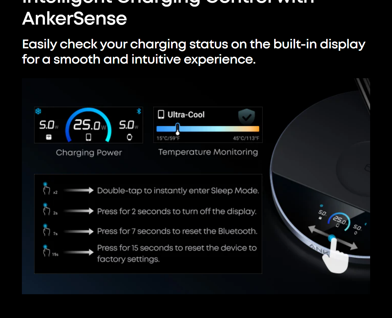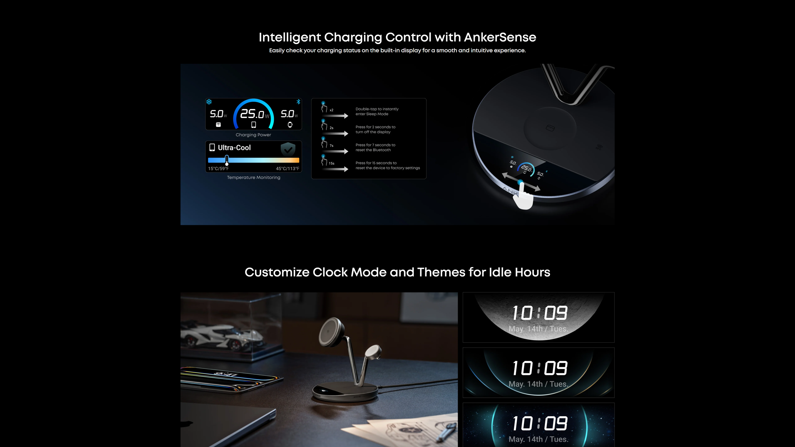 Connect via NFC or Bluetooth in the Anker app to check charging status, switch modes, schedule day or night cycles that automatically enter or exit Sleep Mode, set screensavers, and more. With NFC quick launch, a single tap connects you instantly.
