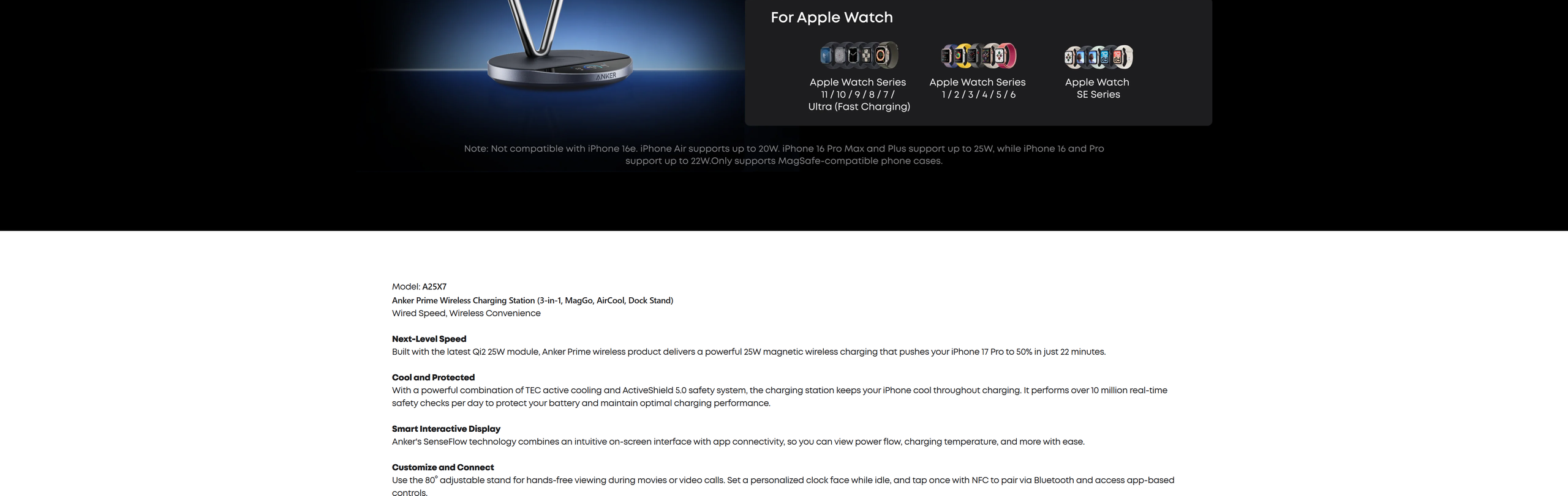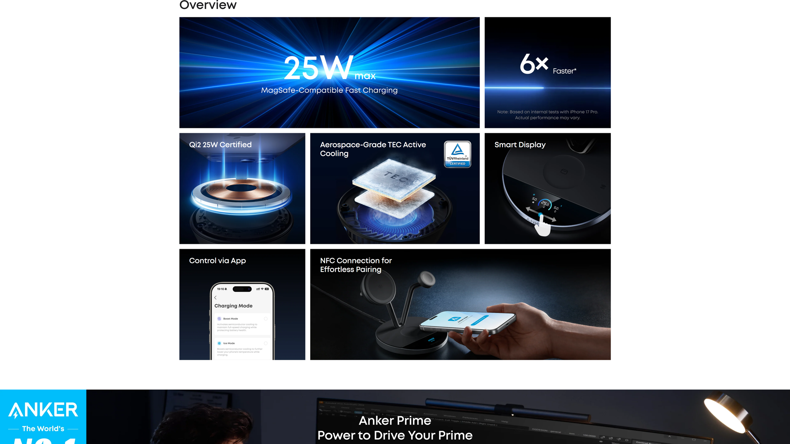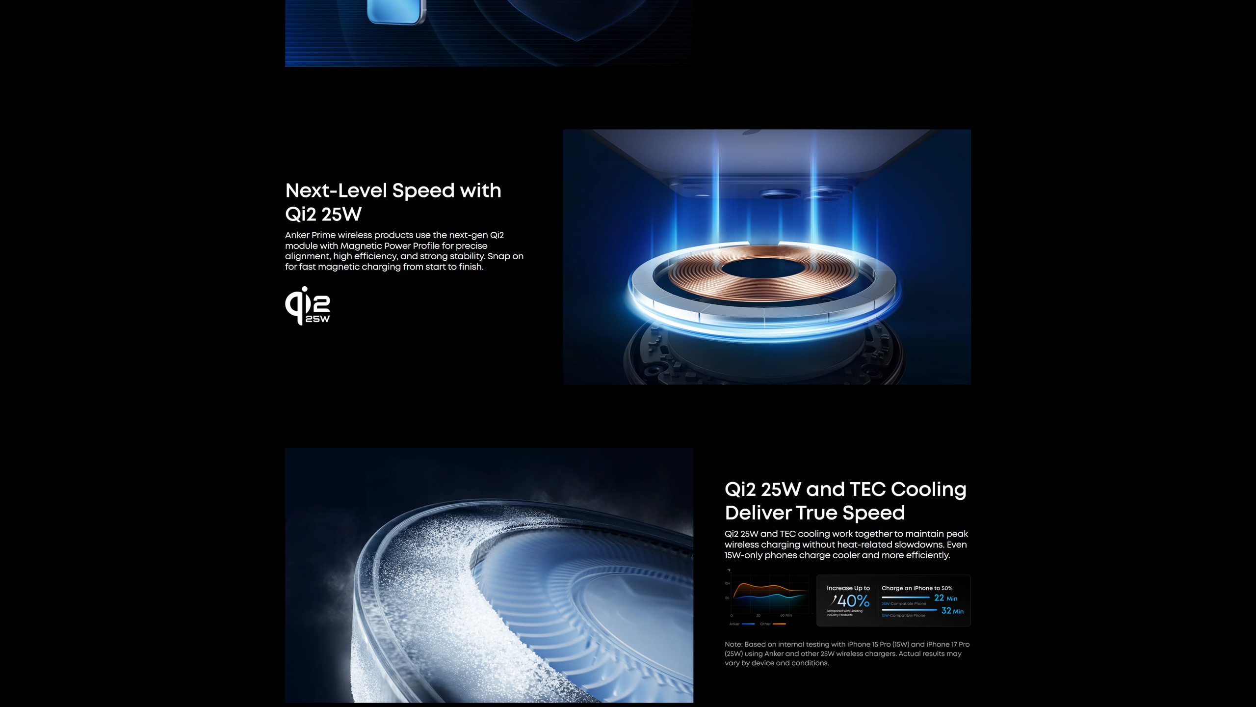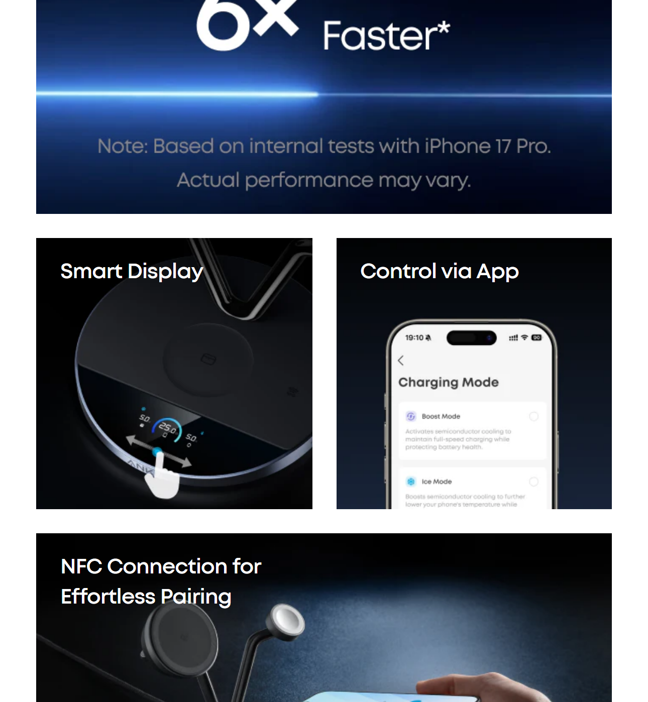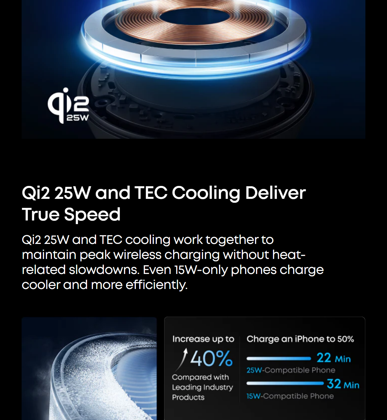 Charge your iPhone 17 Pro to 50% in just 22 minutes—exceeding the limits of standard 25W wireless charging with TEC active cooling. Enjoy wired-level speed with the convenience of wireless, up to 6× faster than 5W wireless. While charging and in use, stays cool and stable—up to 4× faster than 5W wireless. Actual performance may vary.