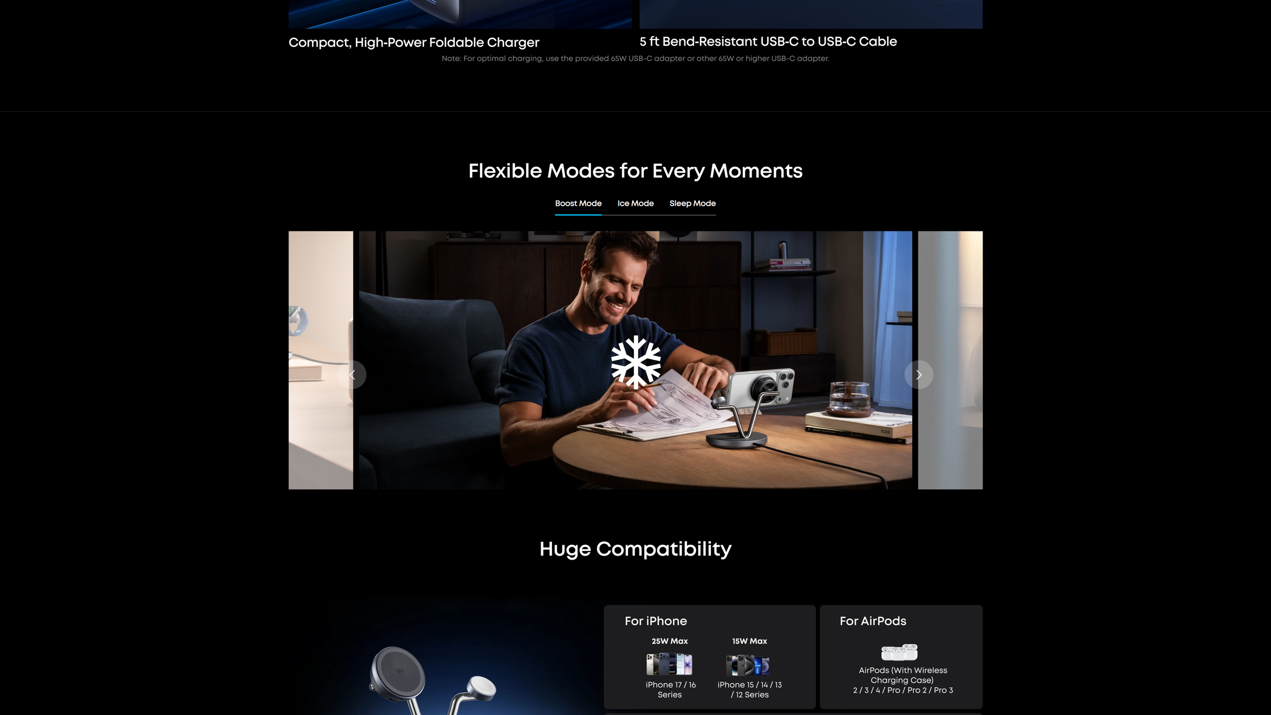 Switch between 3 smart charging modes to match your daily routine. Boost Mode delivers high-power charging to keep your phone cool during quick top-ups. Ice Mode provides maximum cooling with rapid charging performance, ideal for charging while in use. Sleep Mode turns off cooling and dims the display for quiet overnight charging.